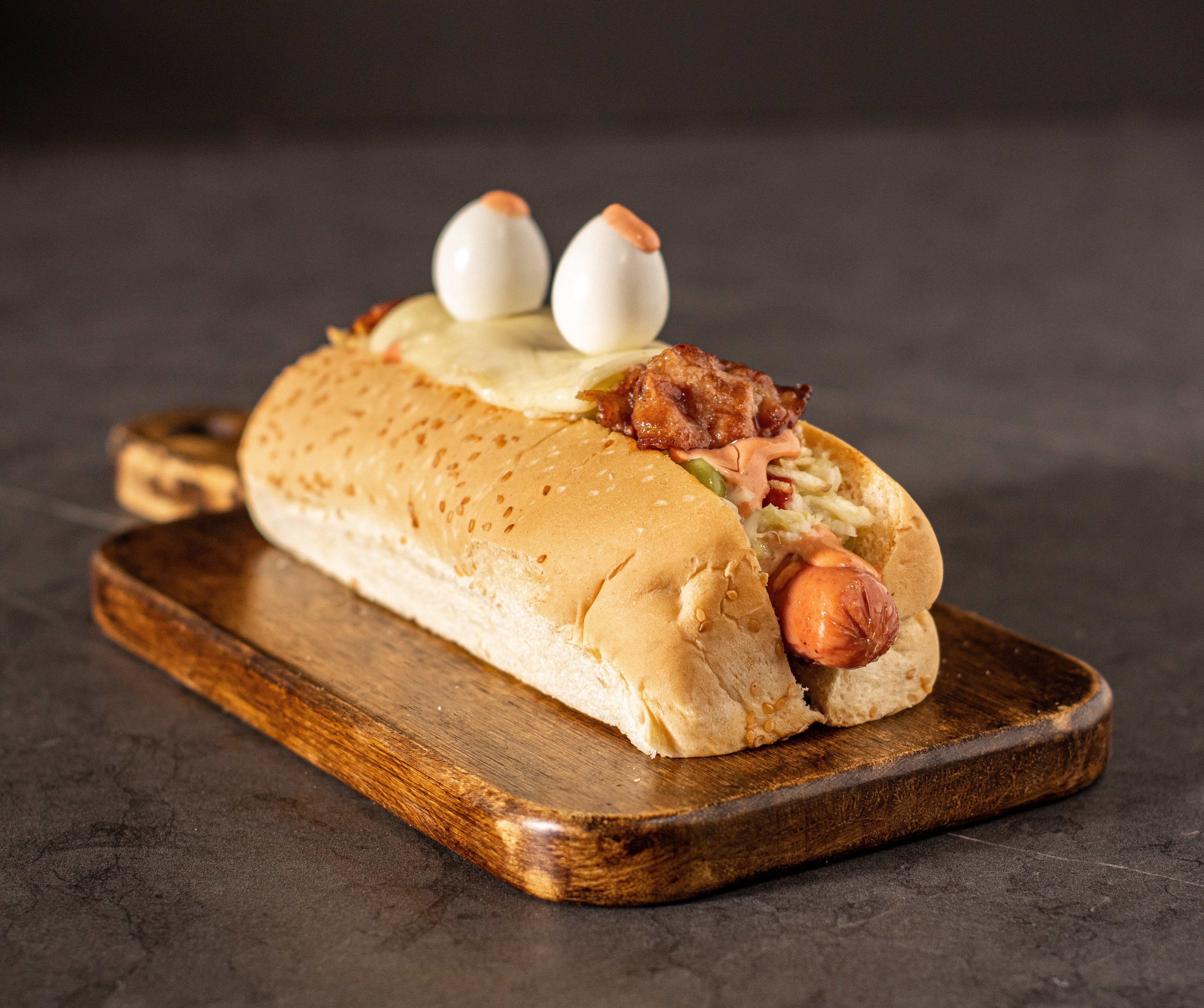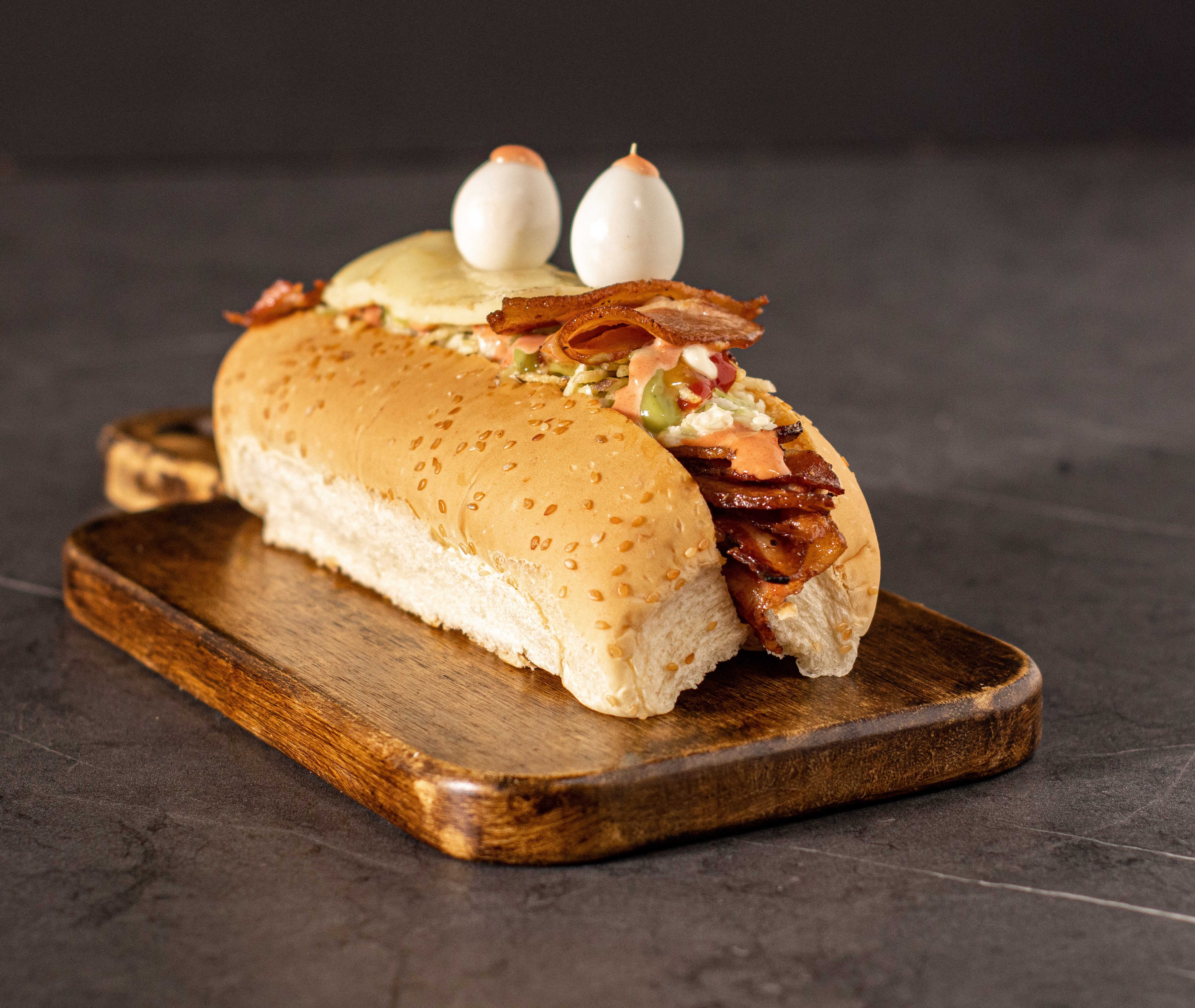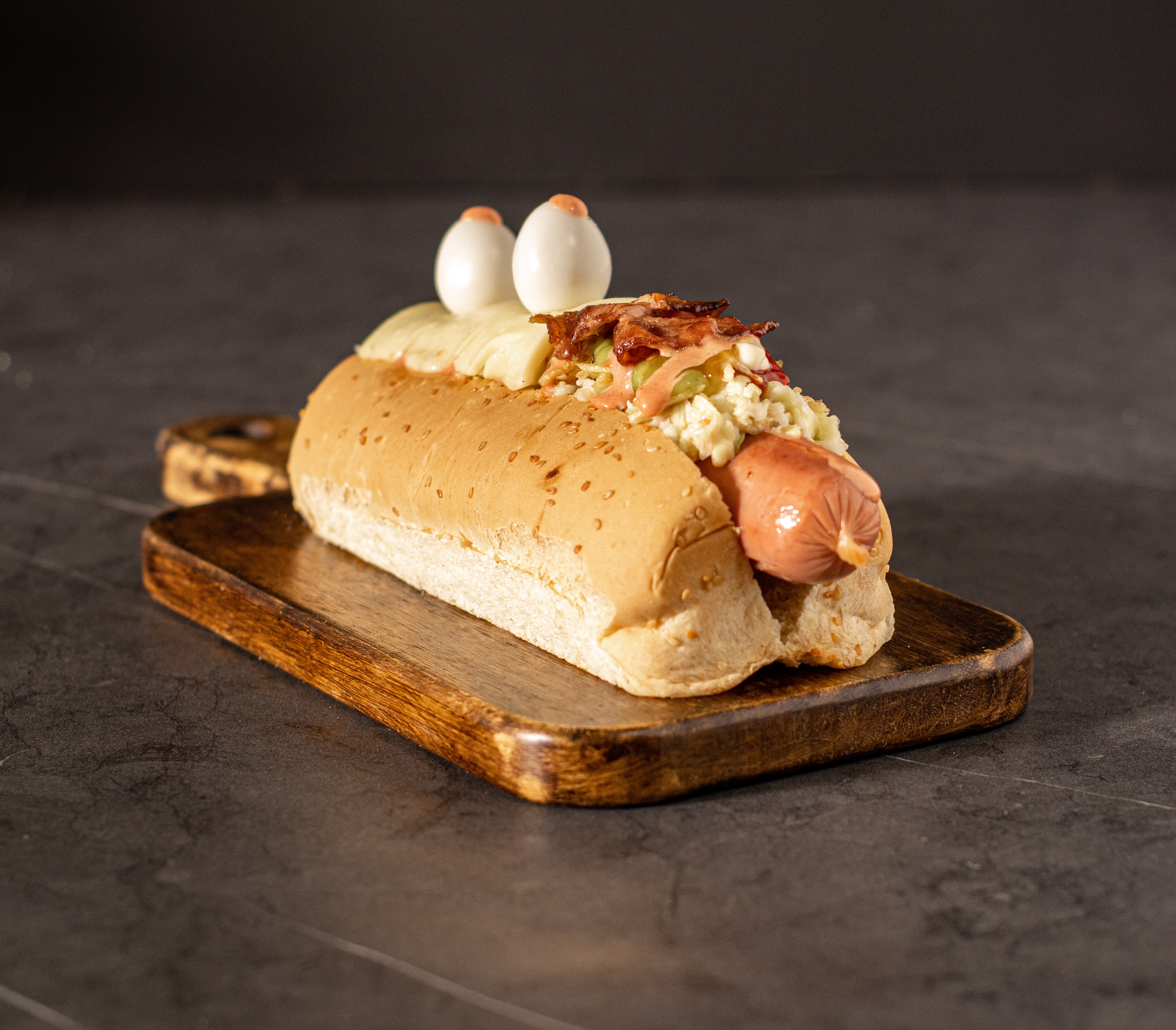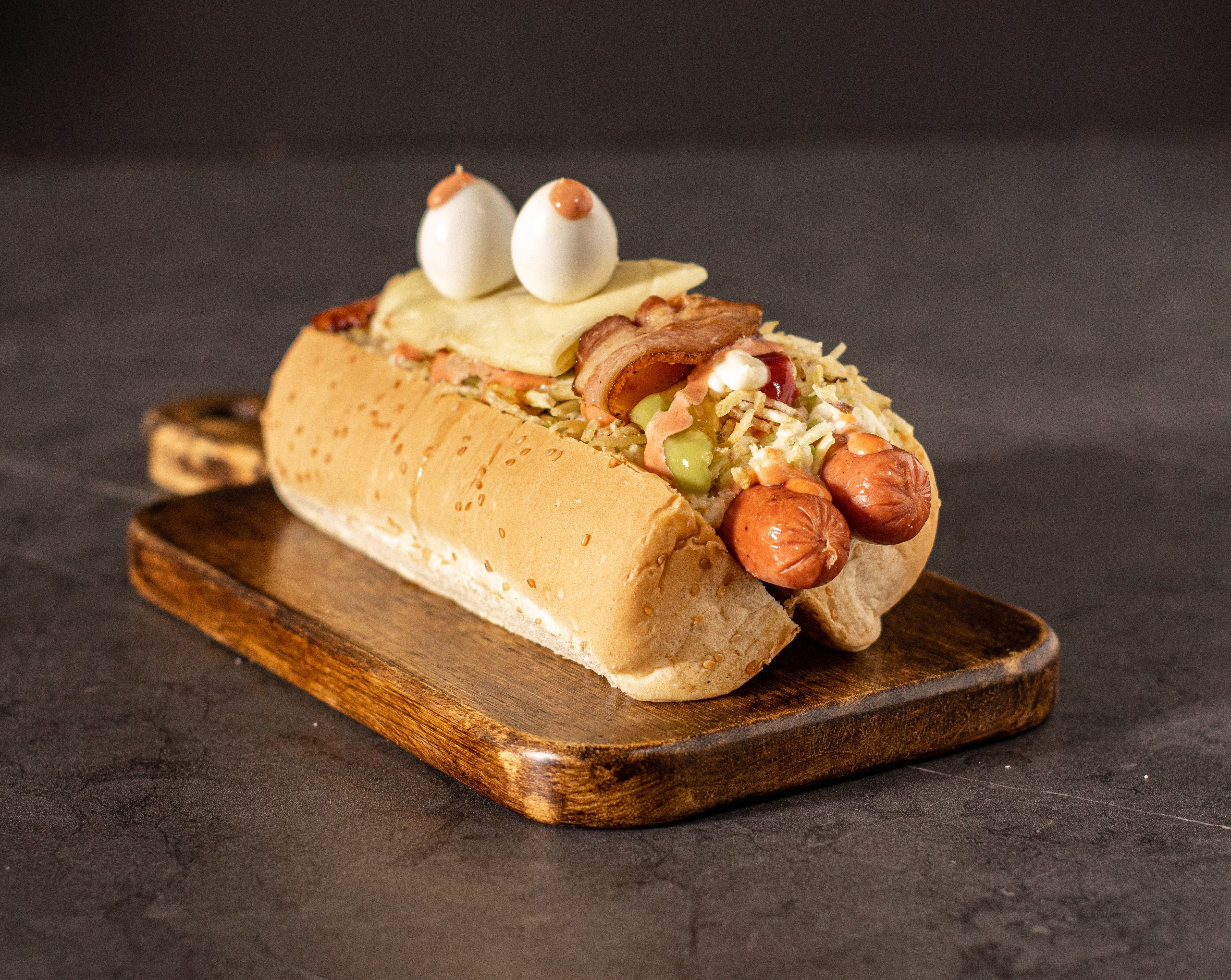 Pan, doble salchichas, ensalada, papa triturada, tocineta, queso mozzarella, huevos de codorniz y salsas.