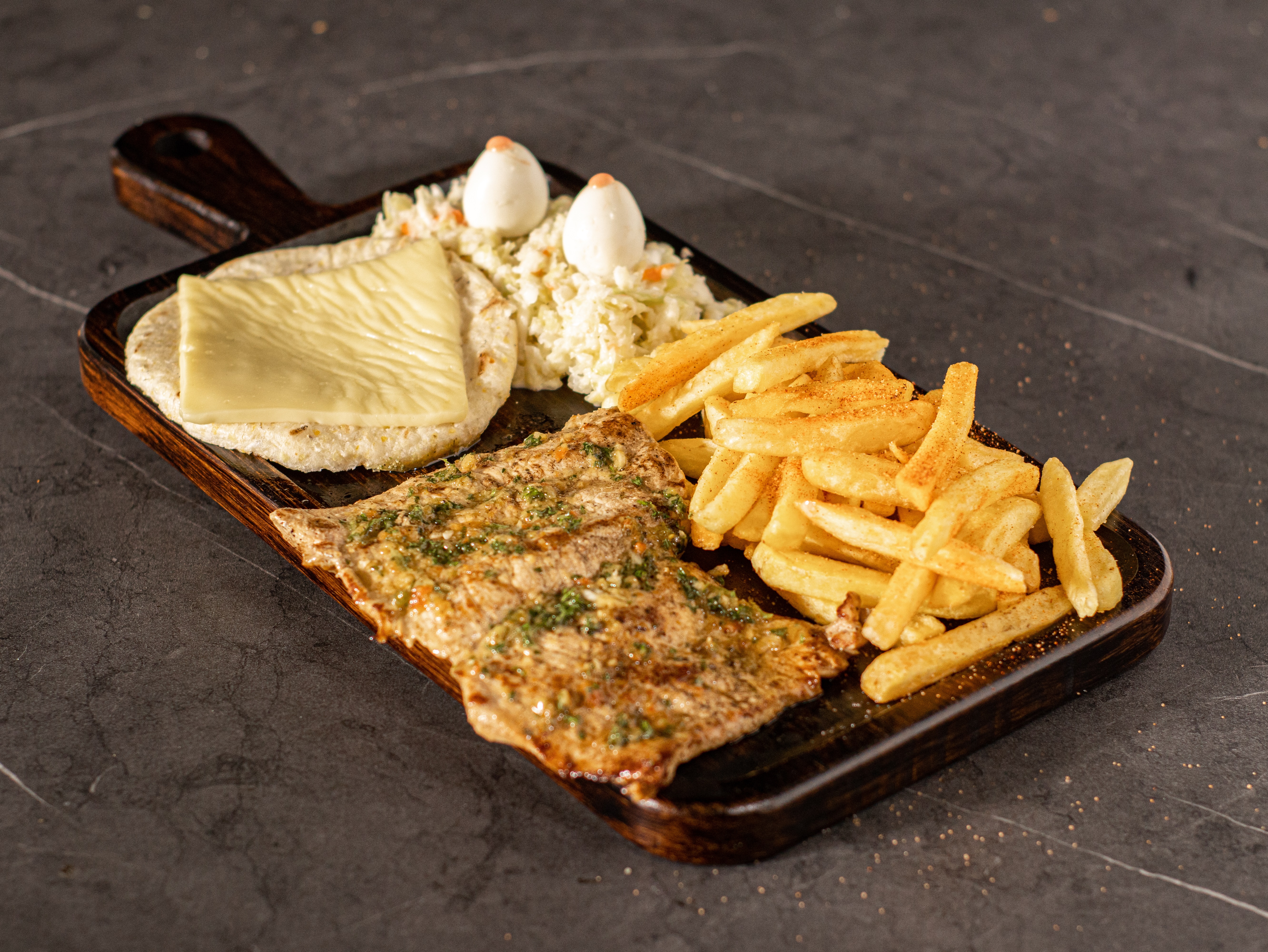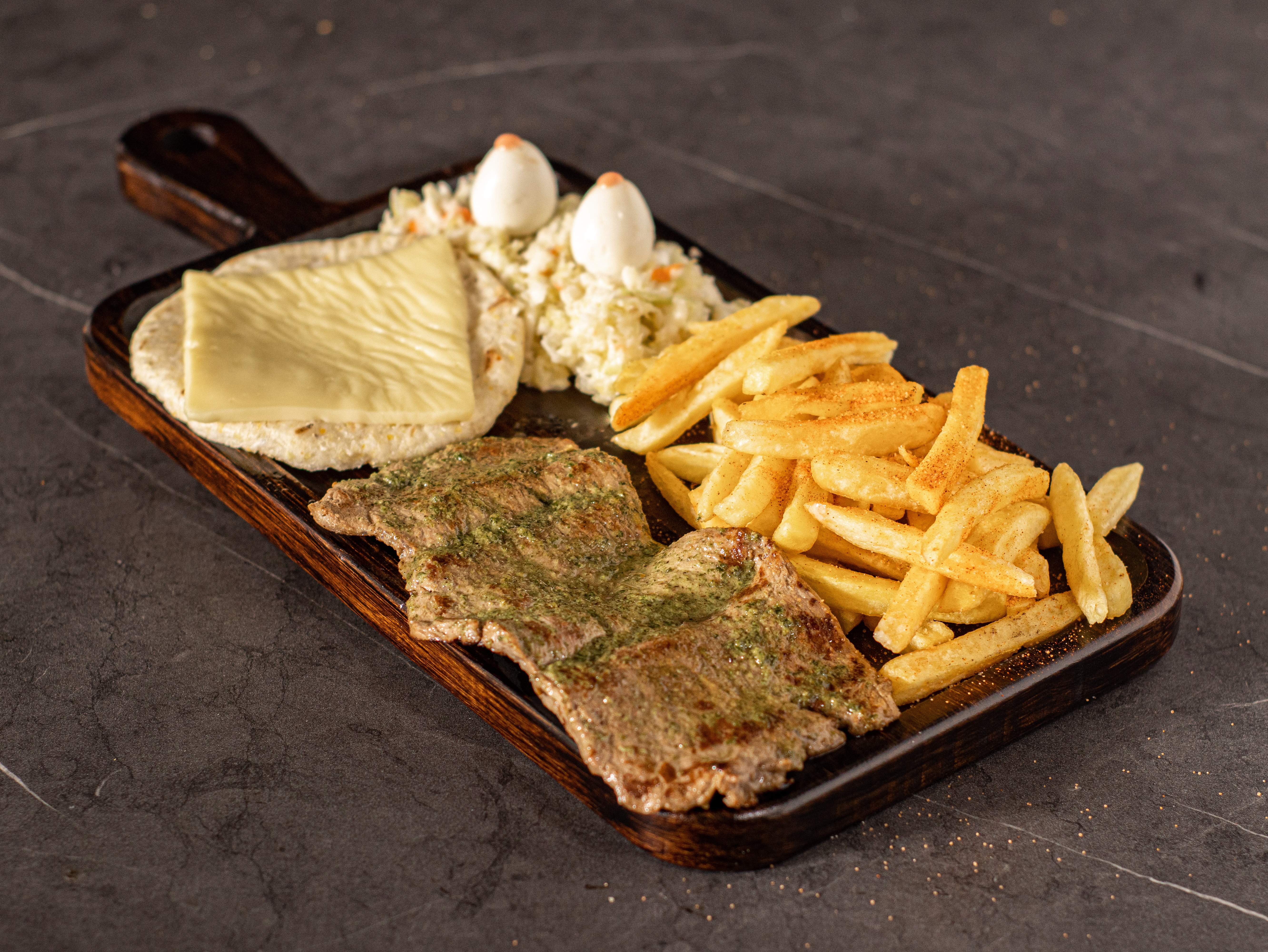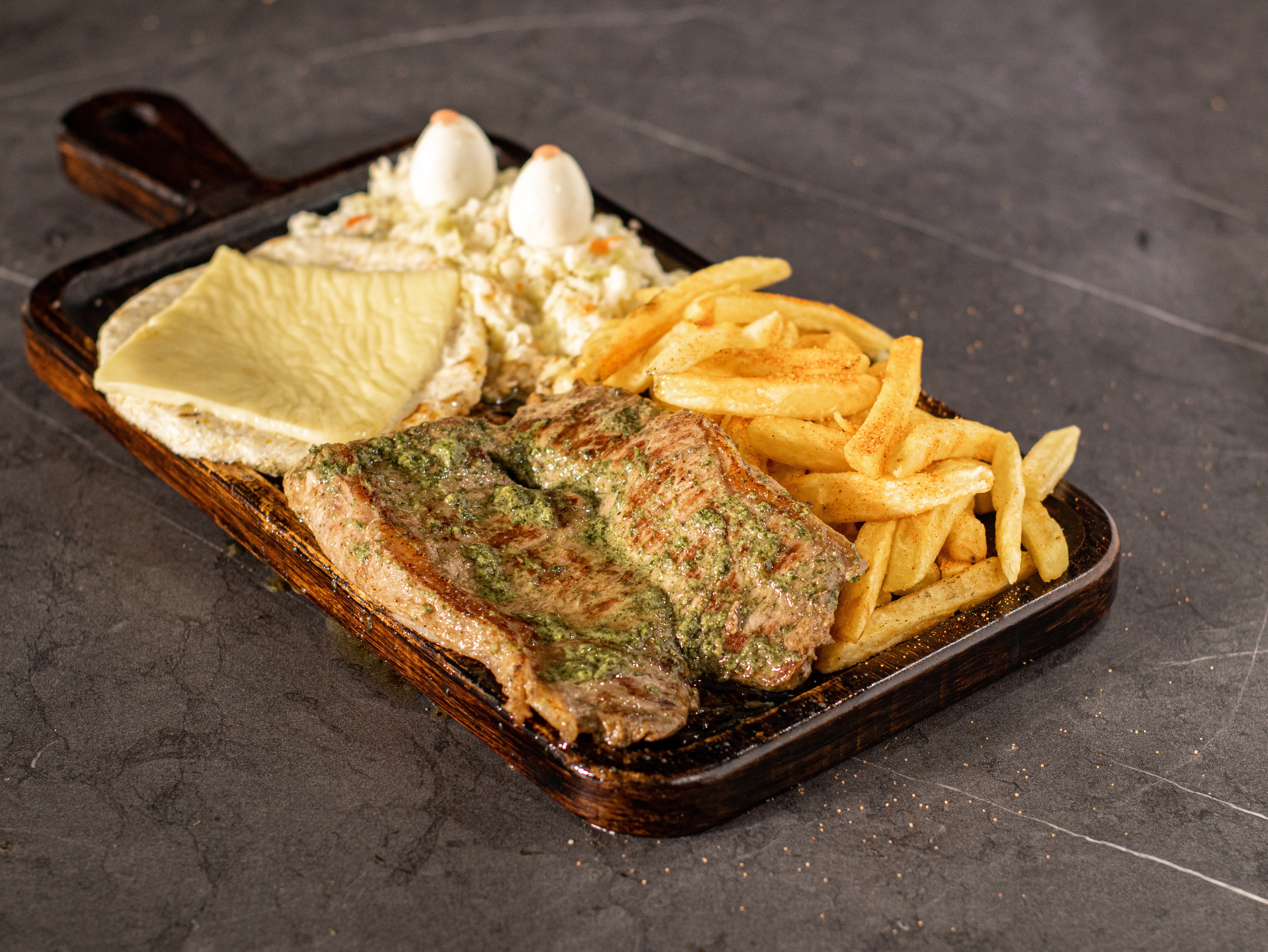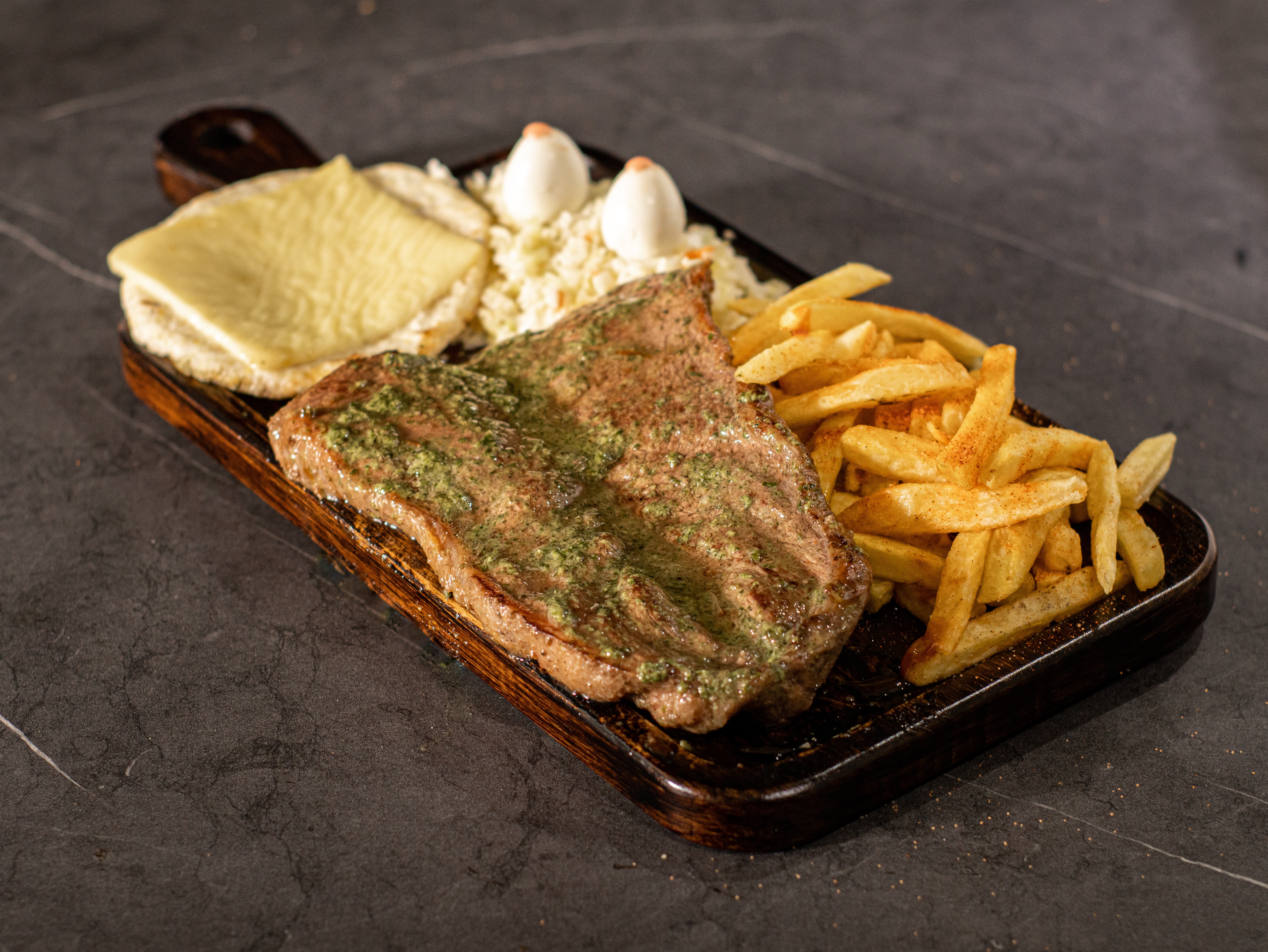 Acompañado de papas a la franseca, arepa, queso mozzarella, ensalada y huevos de codorniz.