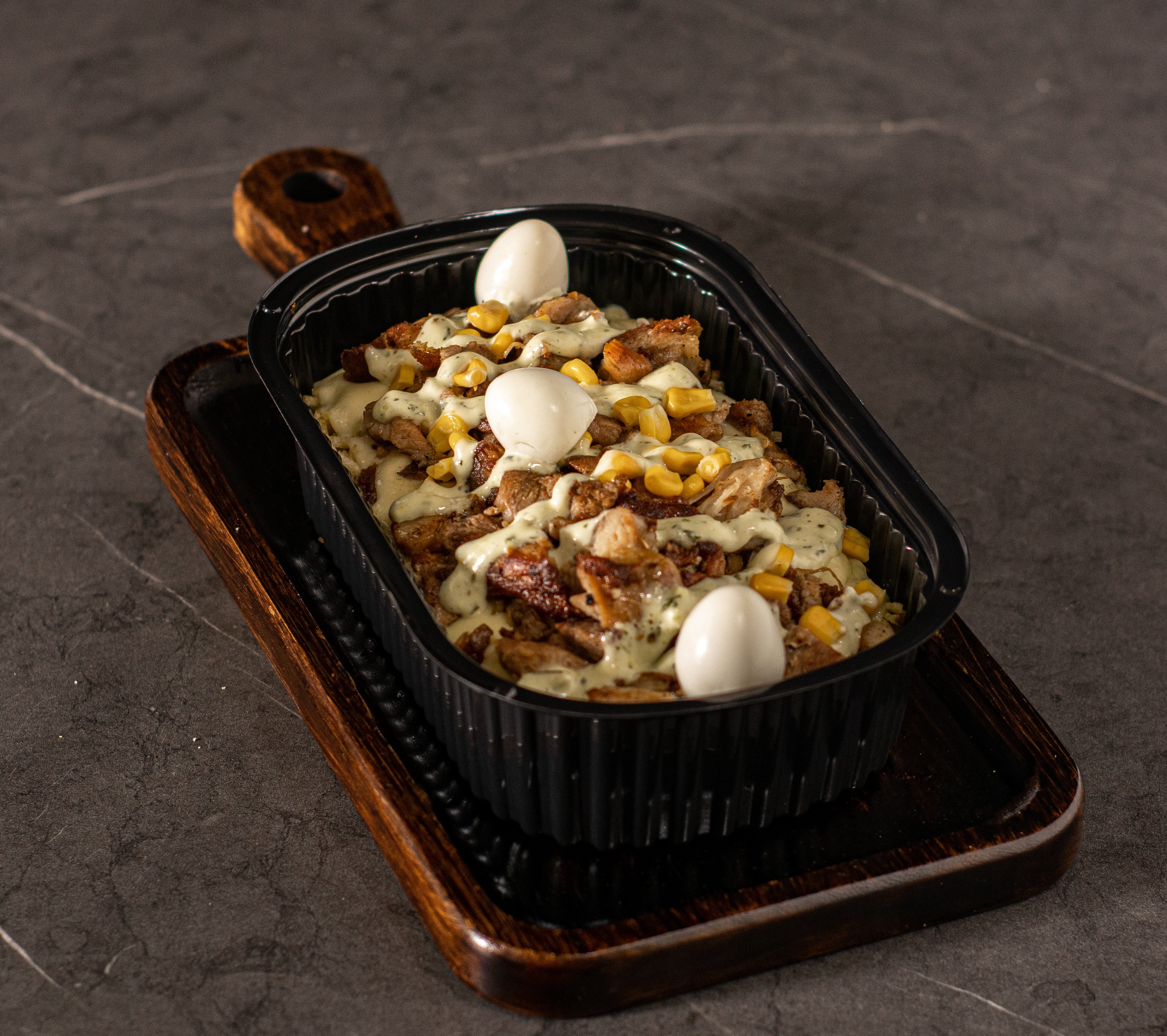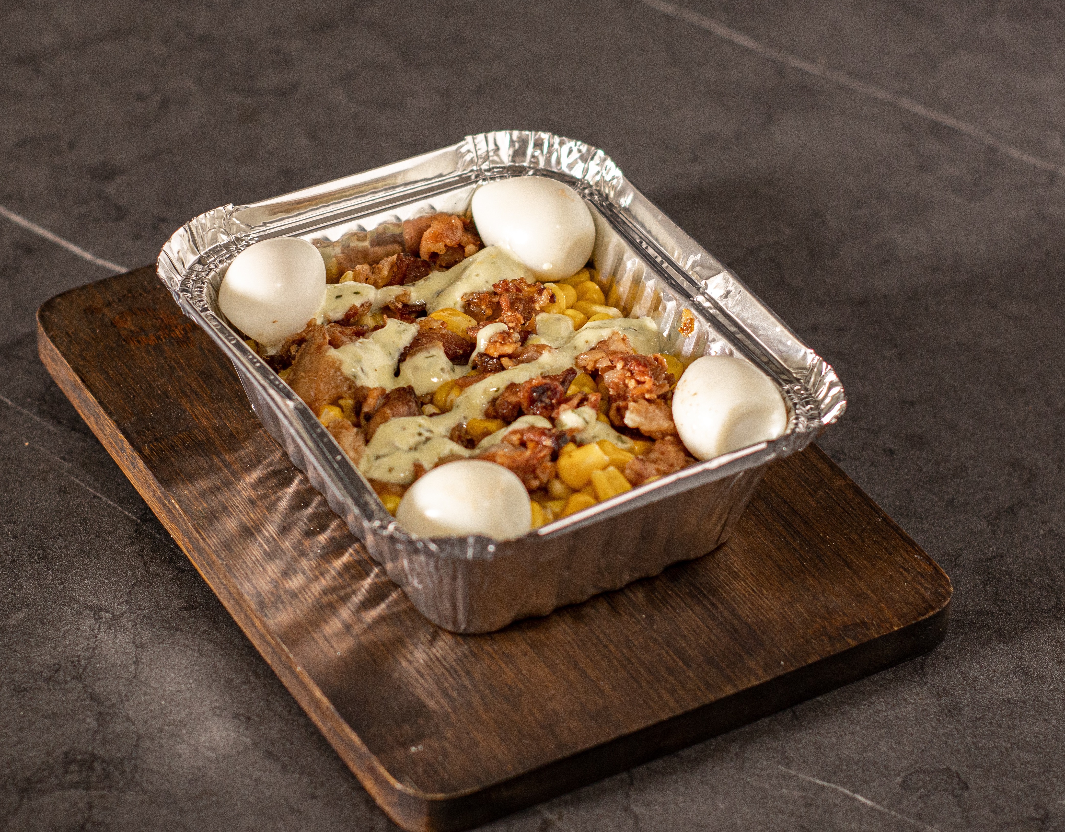 Maicitos, pollo, tocineta, queso gratinado, huevos de codorniz y salsas.