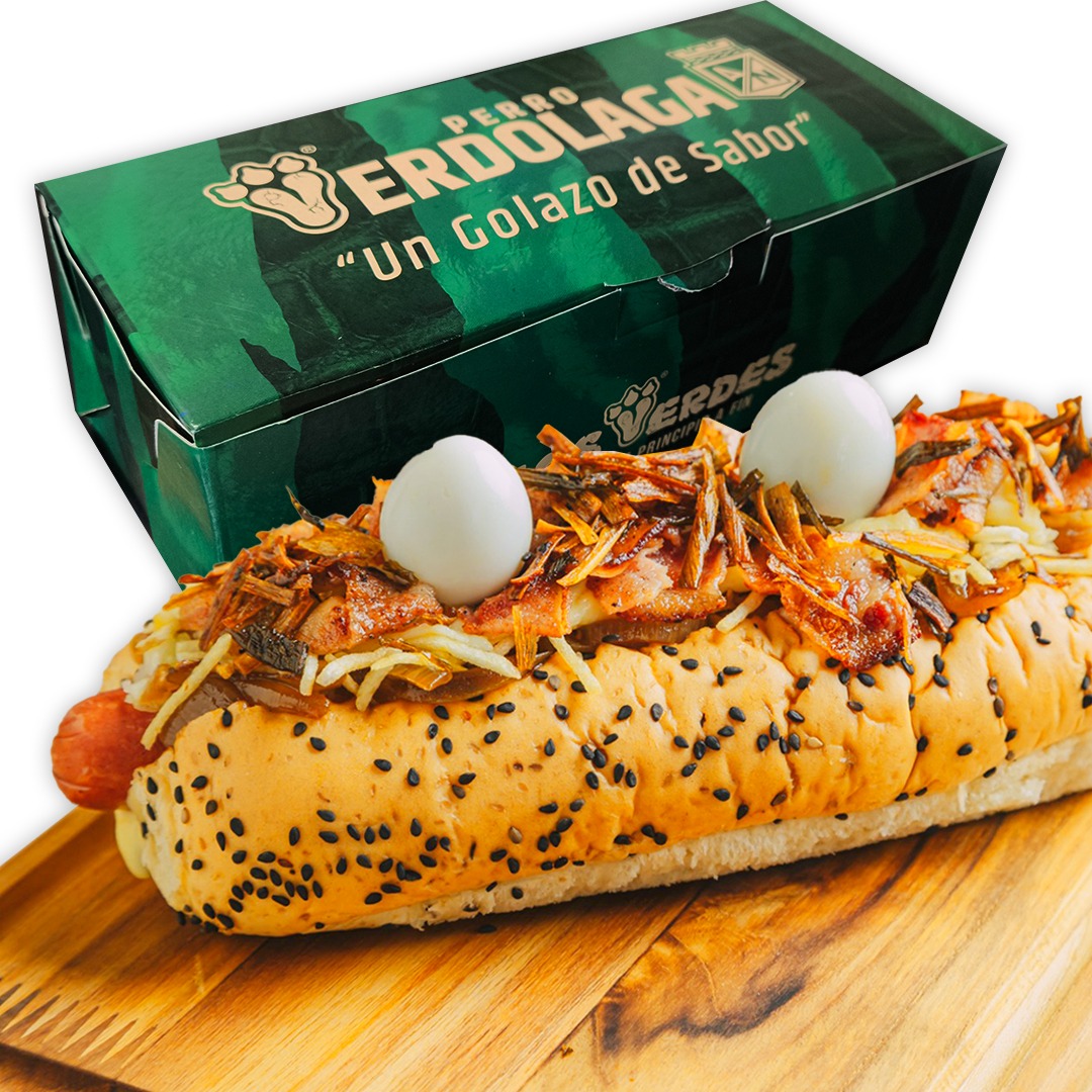 Perro oficial de Atlético nacional, salchicha berlinesa, suave pan con ajonjolí negro, queso mozzarella, cebolla caramelizada, tocino crujiente ahumado, la espectacular cebolla puerro, nuestra deliciosa salsa brasa, papa ripio, ensalada de la casa, huevos de codorniz, guacamole, salsas de la casa. Una explosión de sabor en cada bocado. "Empacada en caja para regalo de Atlético Nacional"