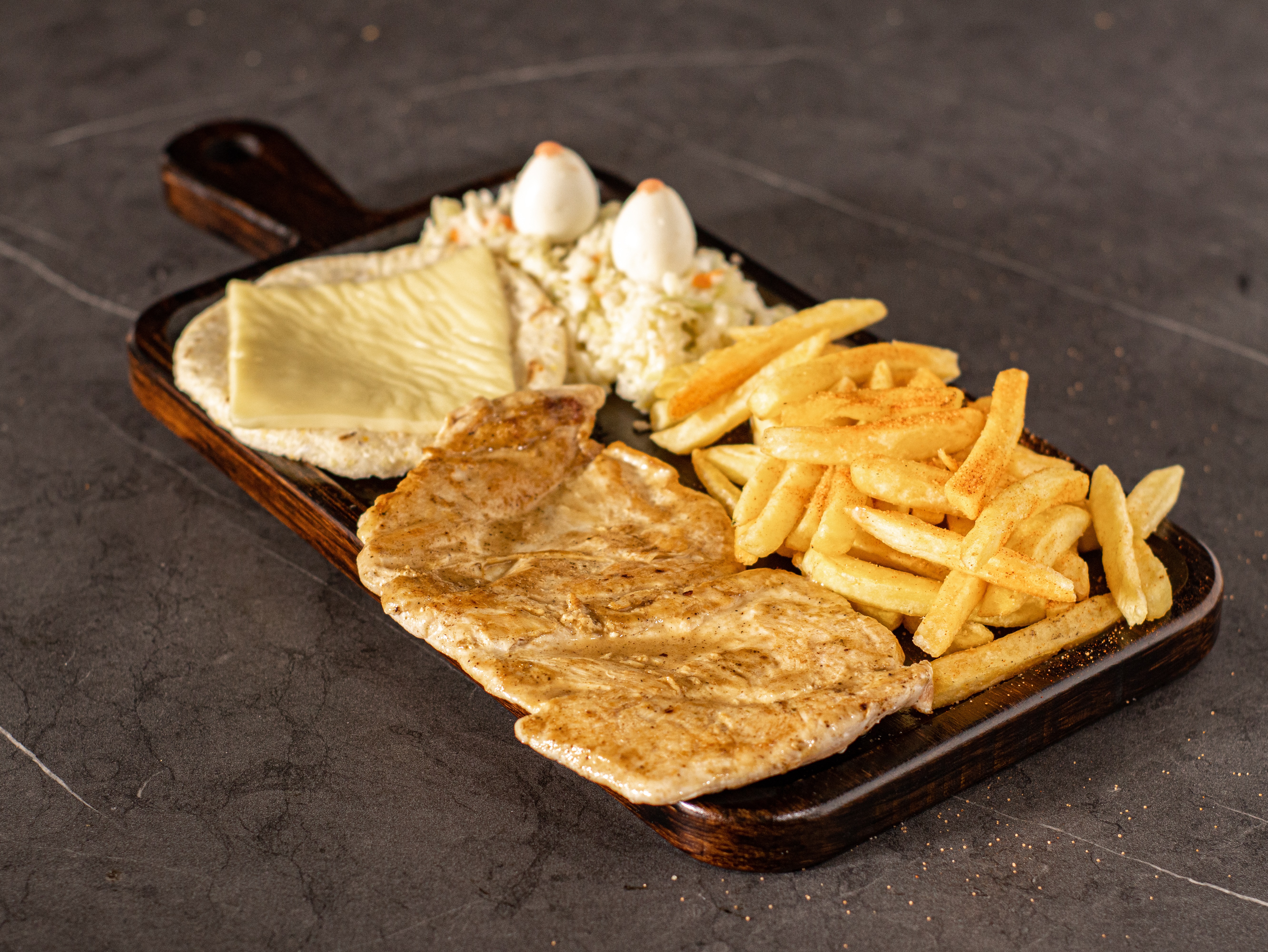 Solomo, cañón, pechuga, chicharrón ahumado, arepa, queso mozzarella, papas a la francesa, tomate, ensalada, huevos de codorniz y salsa BBQ.