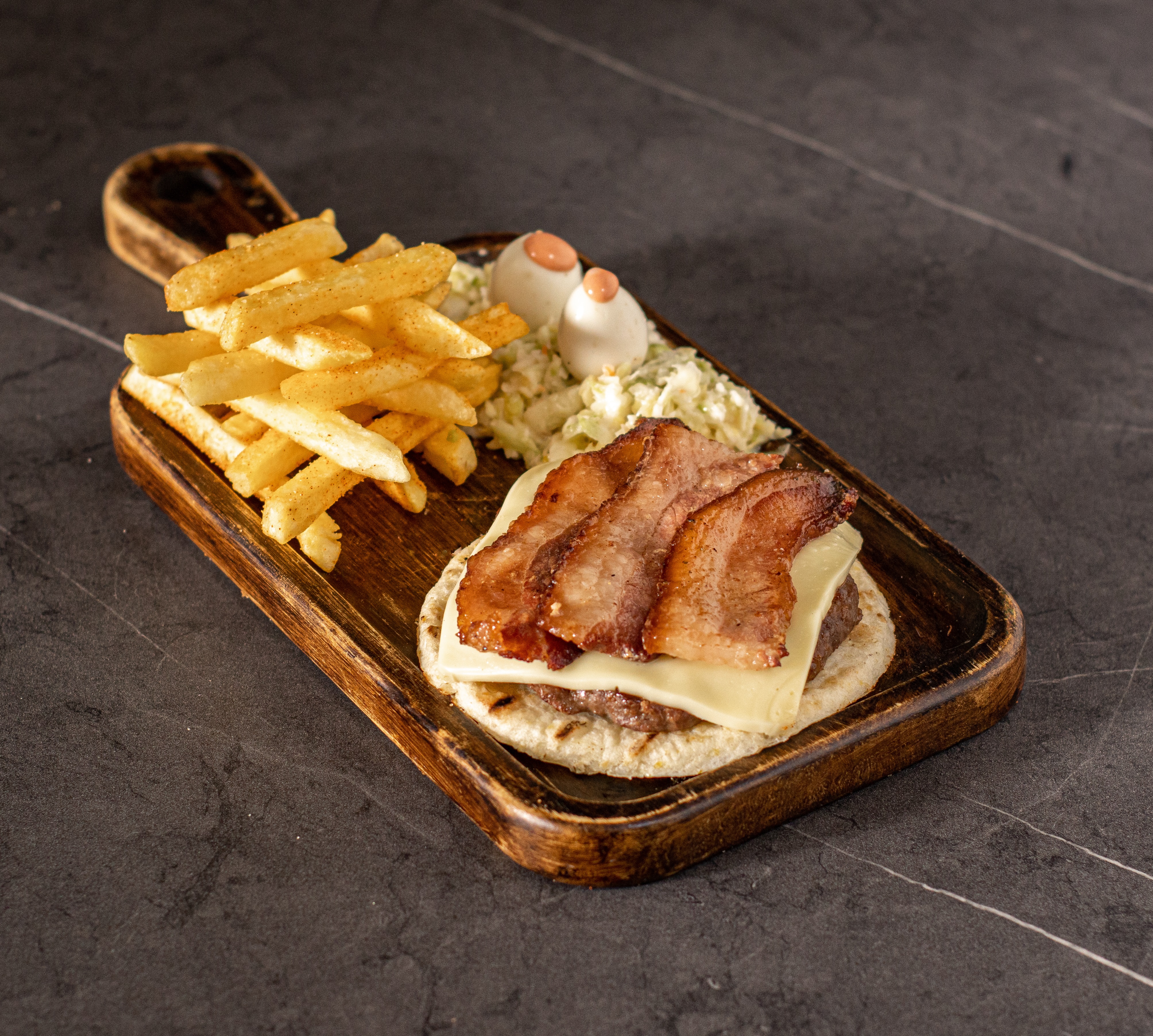 Carne de hamburguesa, arepa, queso mozzarella, papas a la francesa, tocineta, ensalada, huevos de codorniz y salsas.