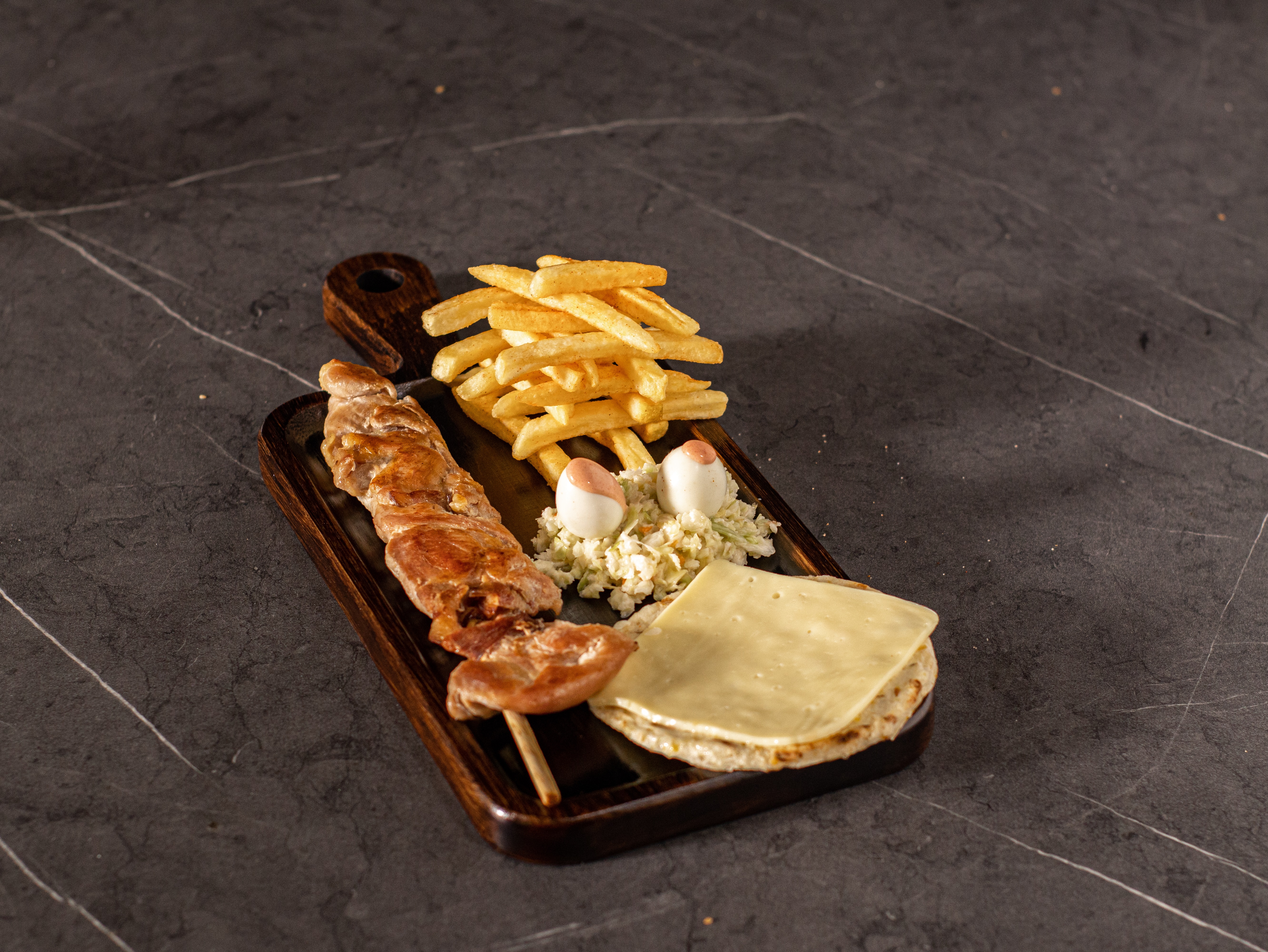 Un chuzo de pollo, un chuzo de cerdo, papas a la francesa, arepa, queso mozzarella, tocineta, ensalada y huevos de codorniz