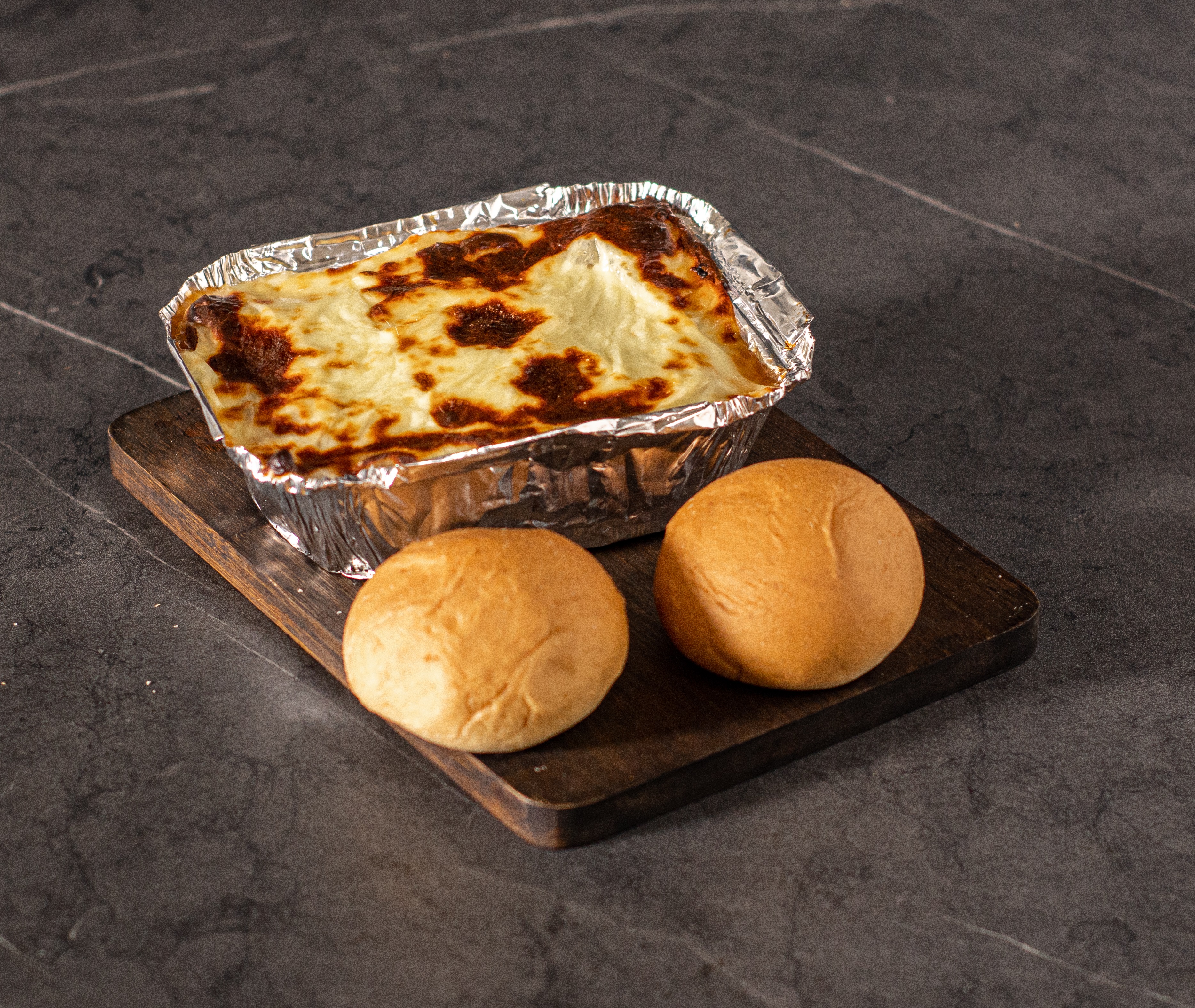 Acompañado de pasta, champiñones, queso gratinado y pan.