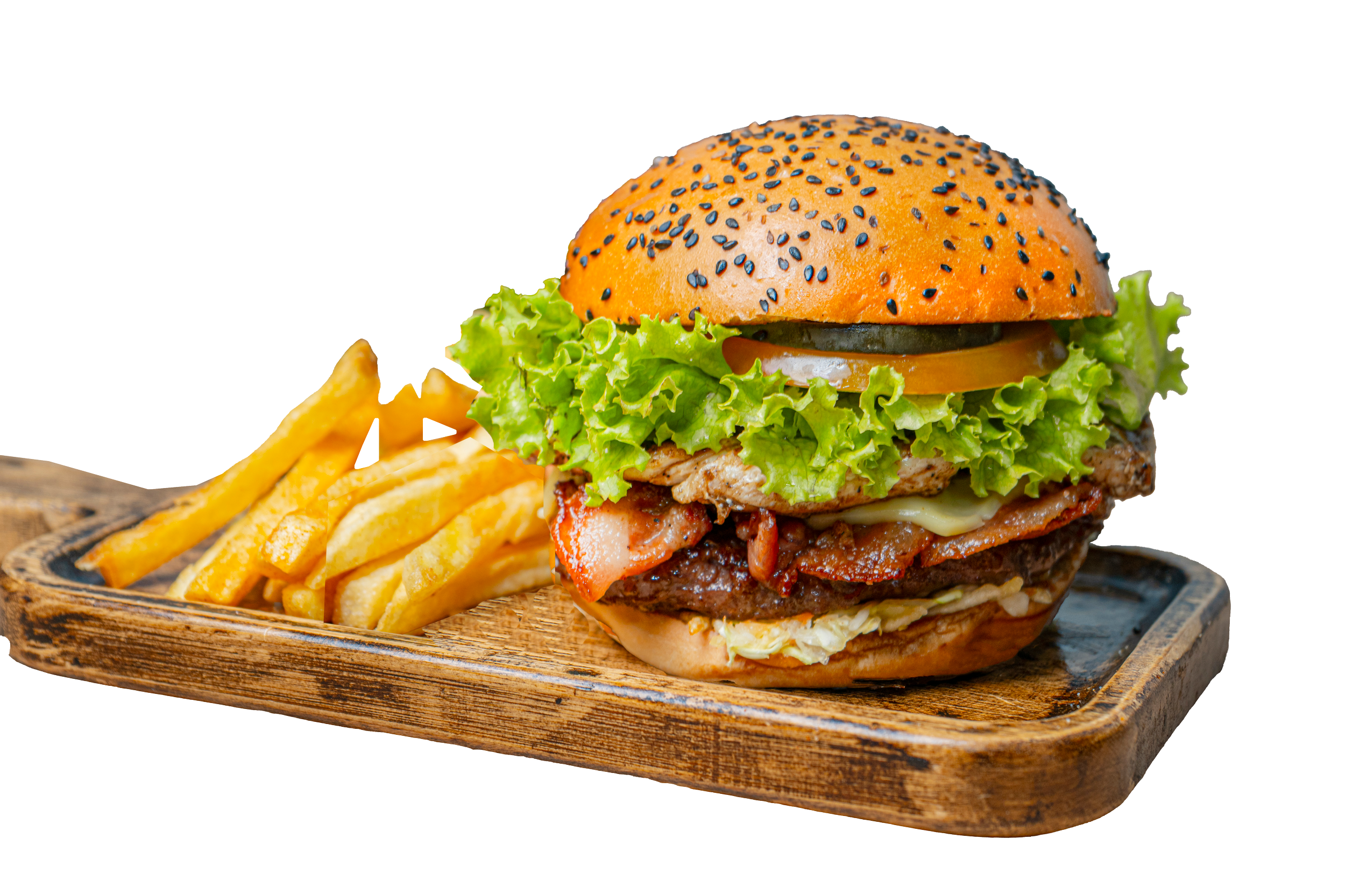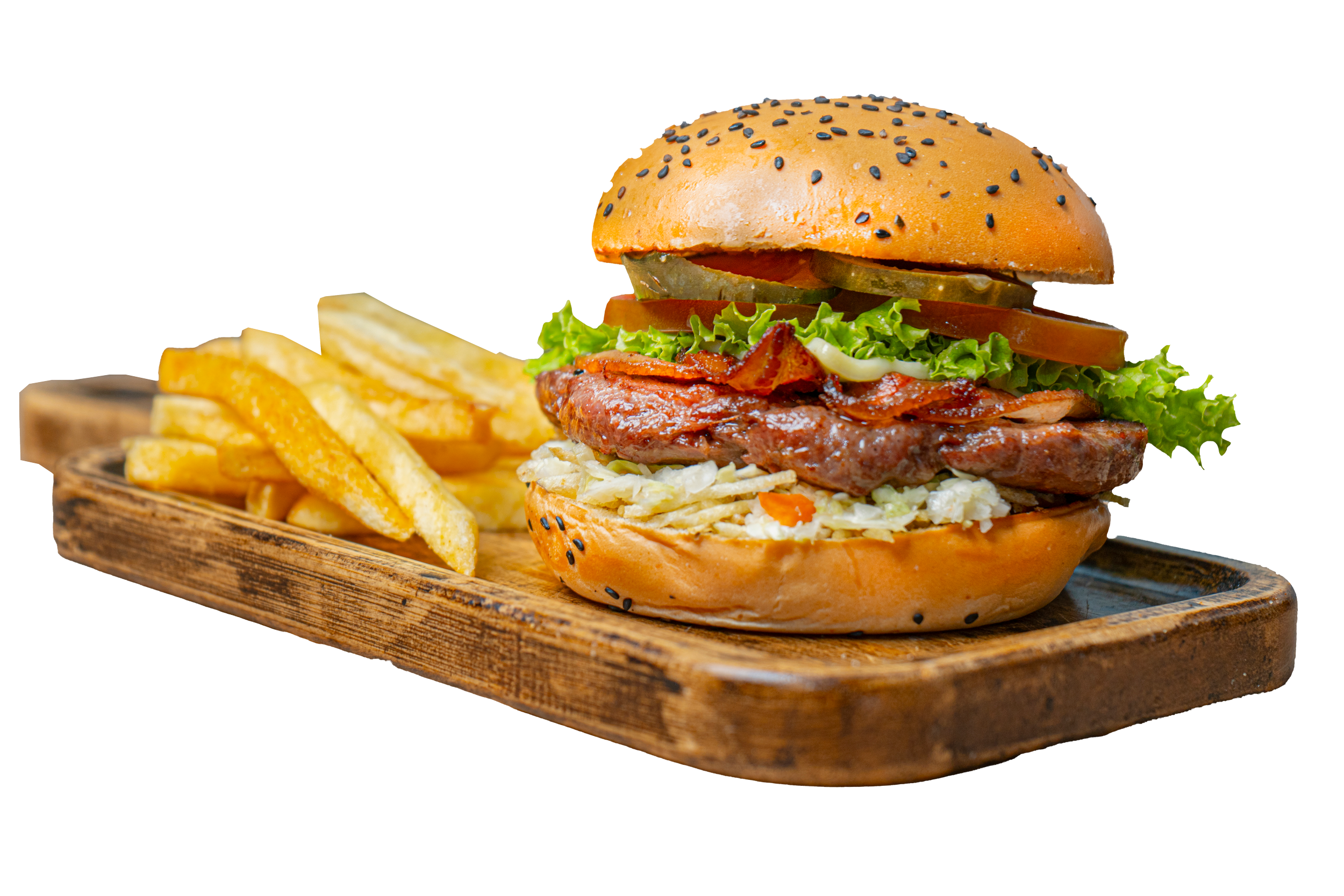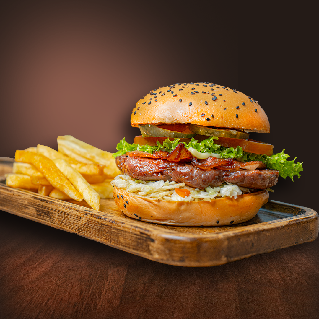 Pan brioche, deliciosa carne premium de 150 gr, tocineta, queso holandes, lechuga, cebolla caramelizada, tomate, salsa ranch, salsa mil islas, y papas en cascos.
