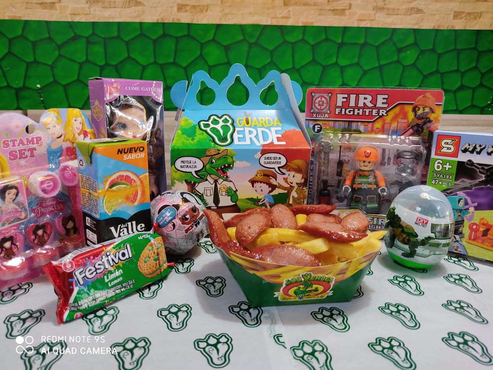 Escoge entre hamburguesa express clásica, perro clásico pequeño, nuggets de pollo o salchipapa con jugo de cajita y juguete.