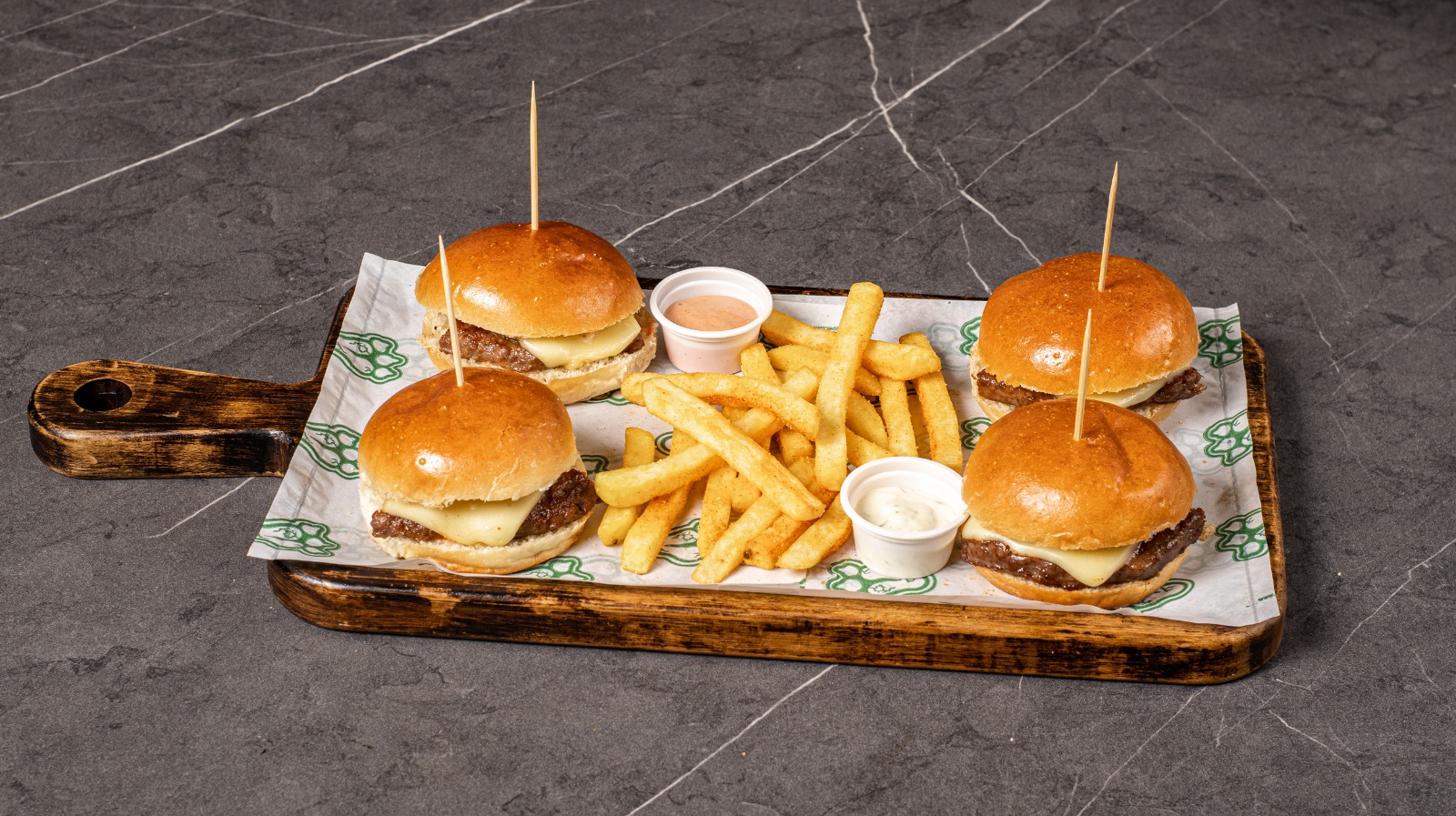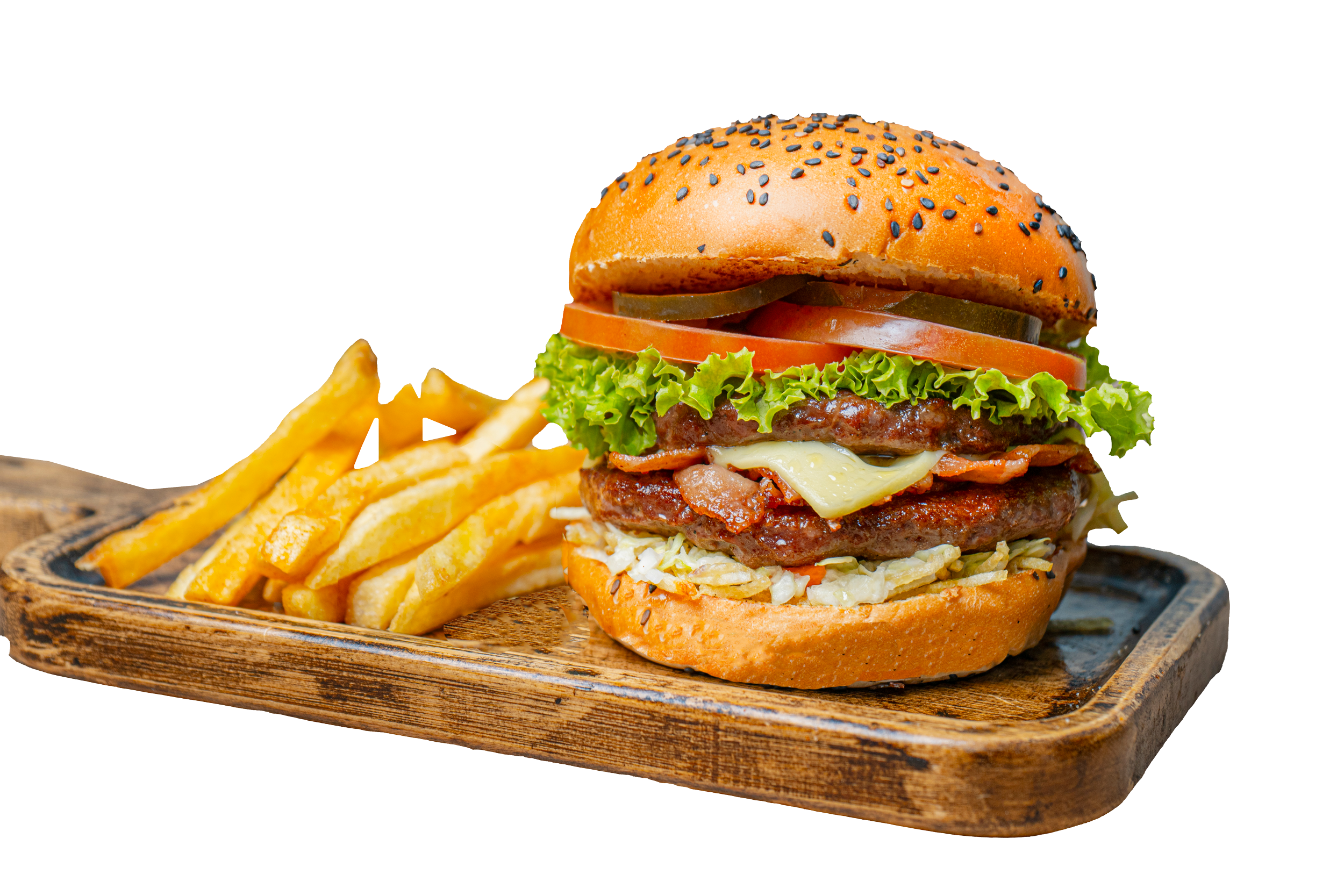 pan, carne de hamburguesa, queso mozzarella, papas a la francesa y salsas de la casa