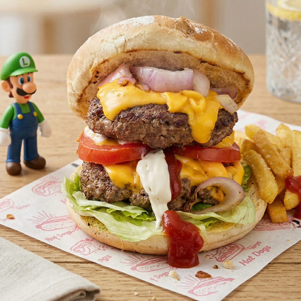 Pan de ajonjolí, 2 carnes de res, queso, tomate, lechuga, cebolla caramelizada, tocineta, acompañada de porcion de papas a la francesa