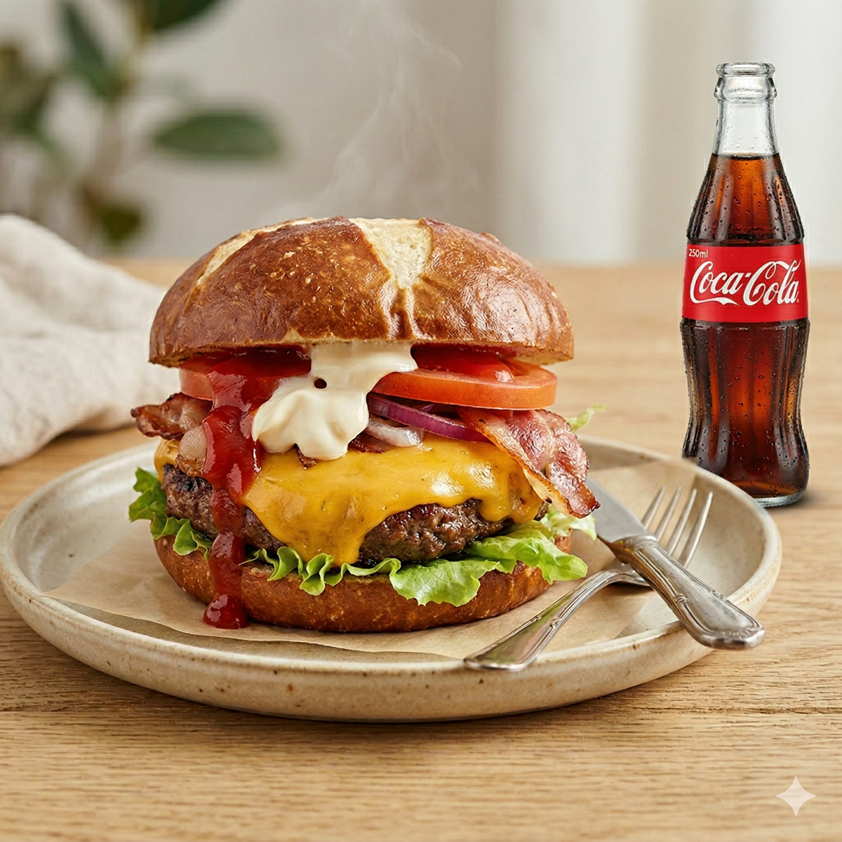 pan artesanal, carne de res 100% artesanal, queso, tomate, lechuga, cebolla caramelizada, tocineta + Gaseosa 250ml