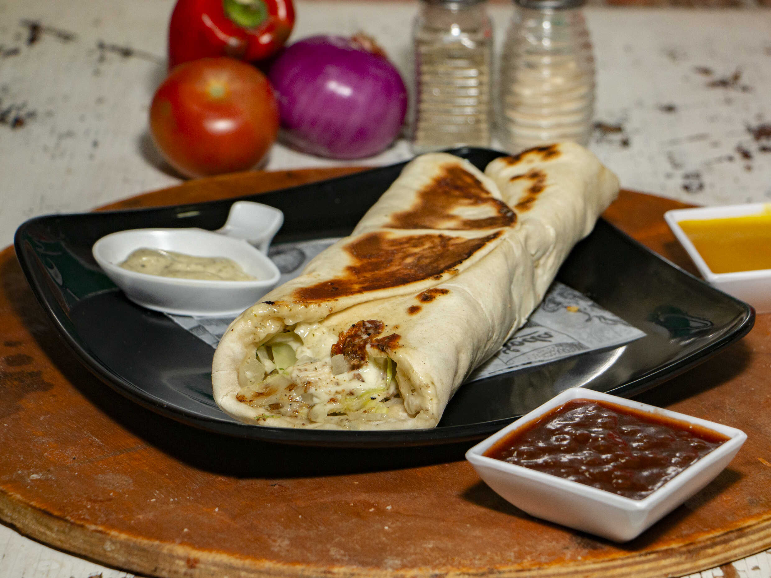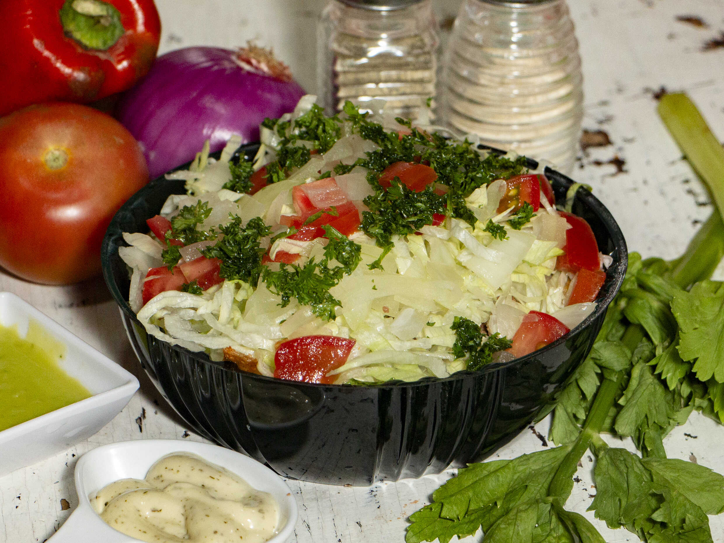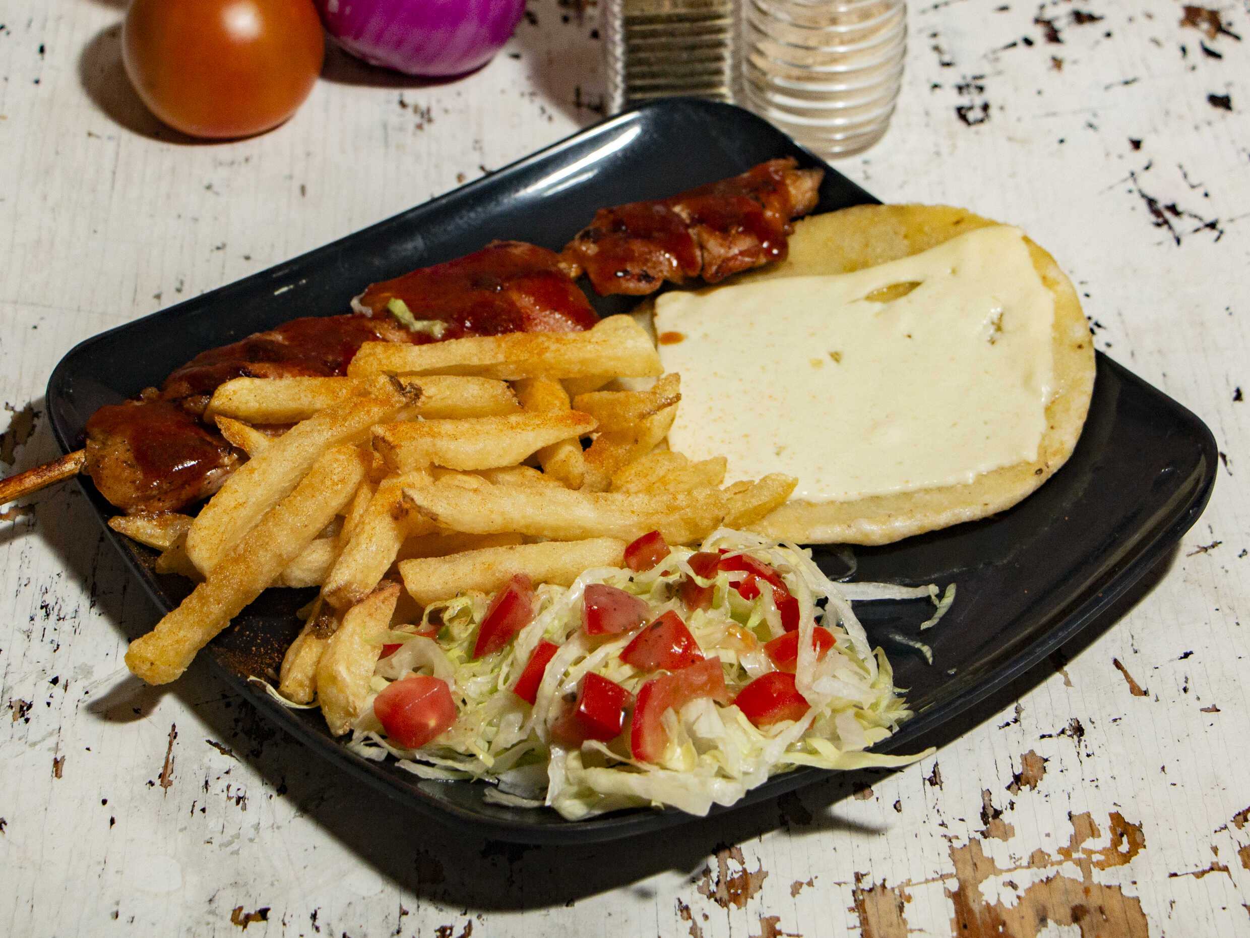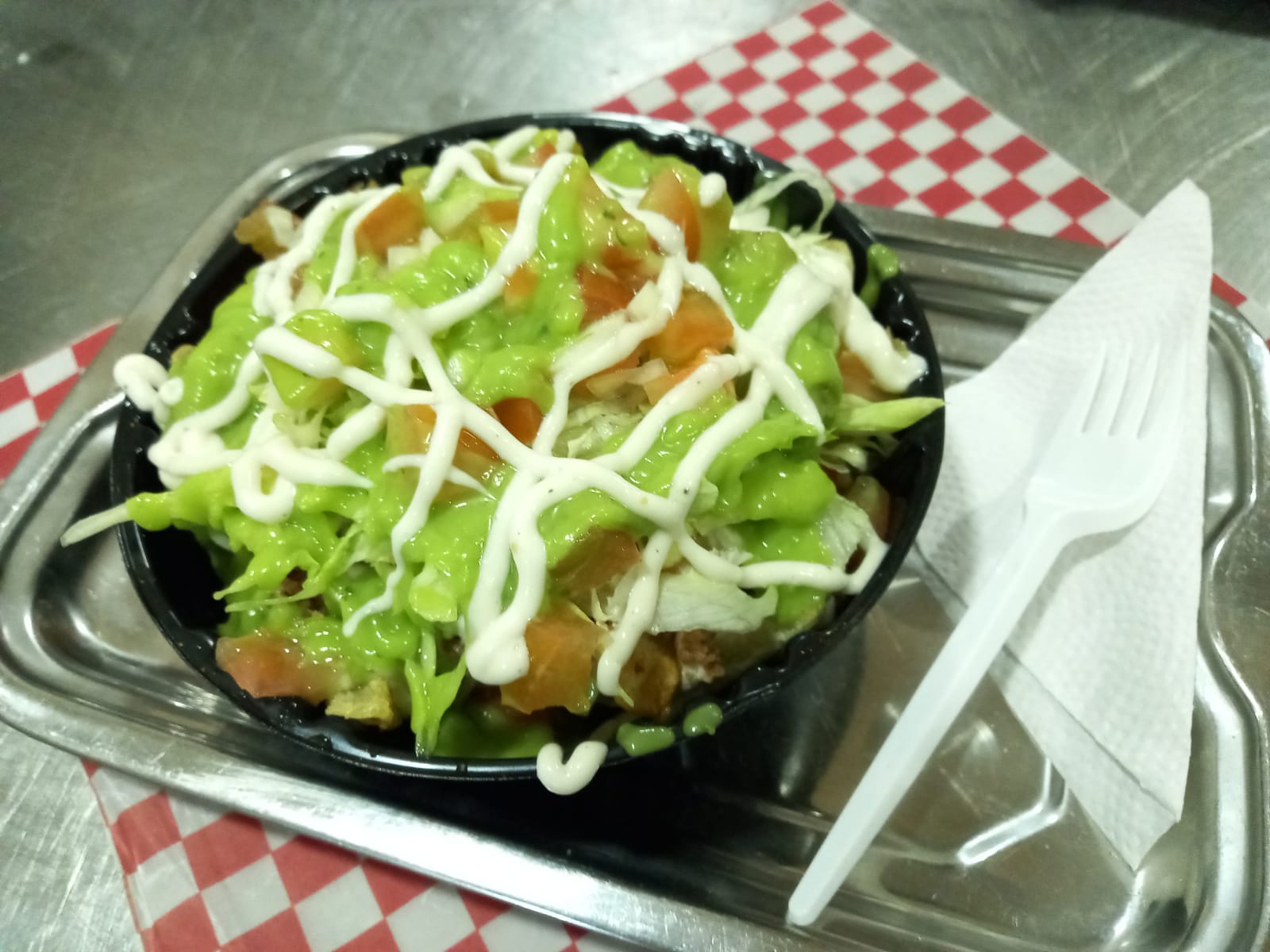 Kebab en ensalada, pollo, carne, queso, tocineta y salsa de ajo.
