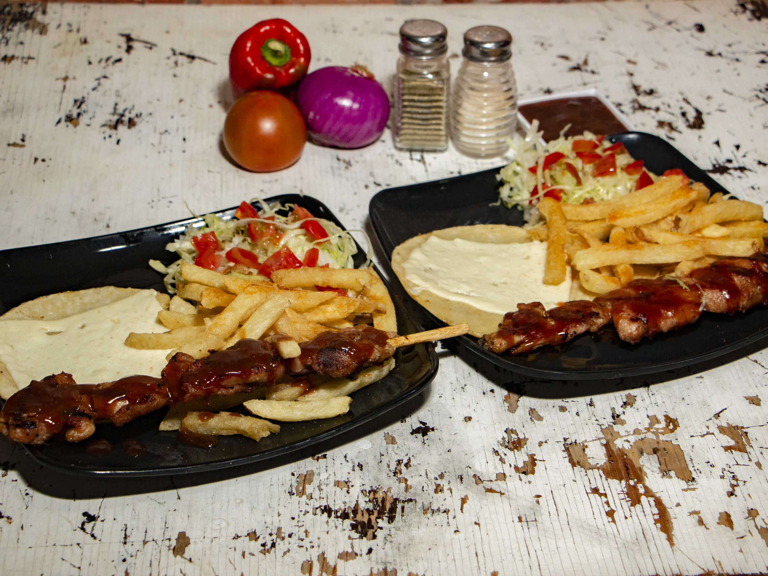 2 papas mexicanas con carne, pollo, salsa de ajo, ensalada pico de gallo, guacamole y jalapeño.