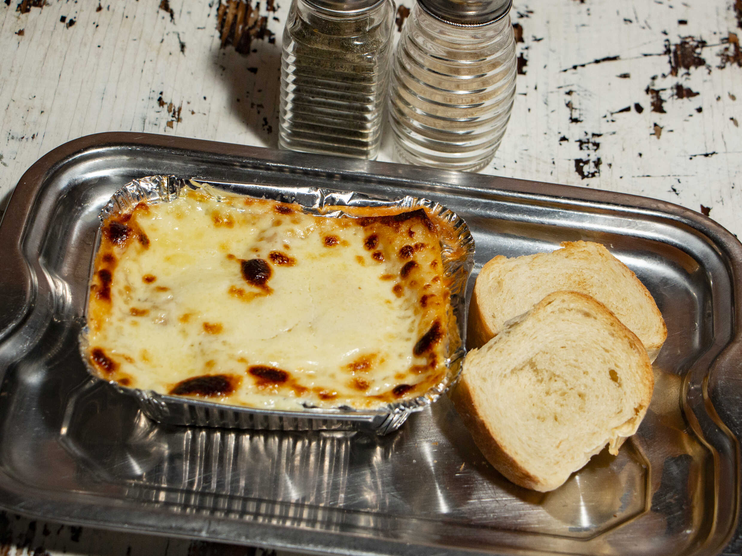 1 lasagna personal mixta de 450gr esta es de carne de res molida y pechuga desmechada, pan de ajo.