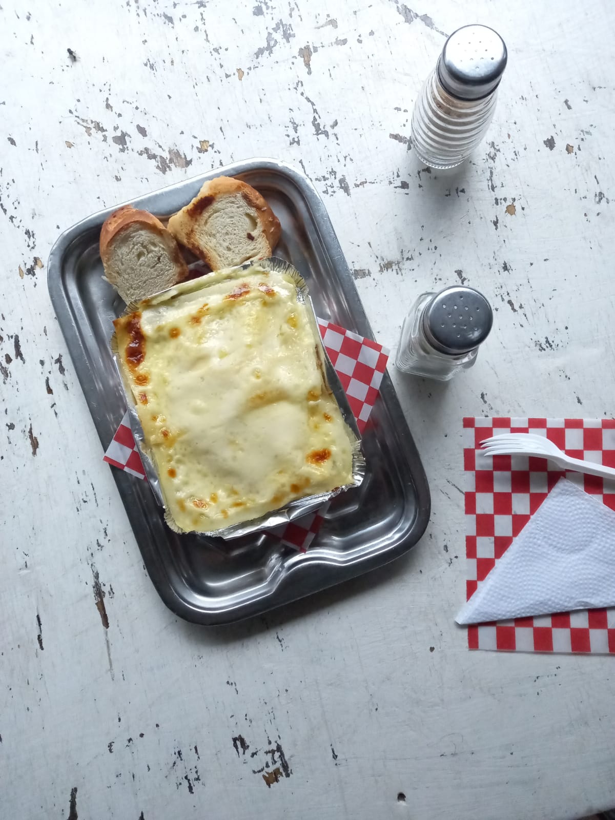 1 lasagna personal mixta de 250gr esta es de carne de res molida y pollo, acompañada pan de ajo.