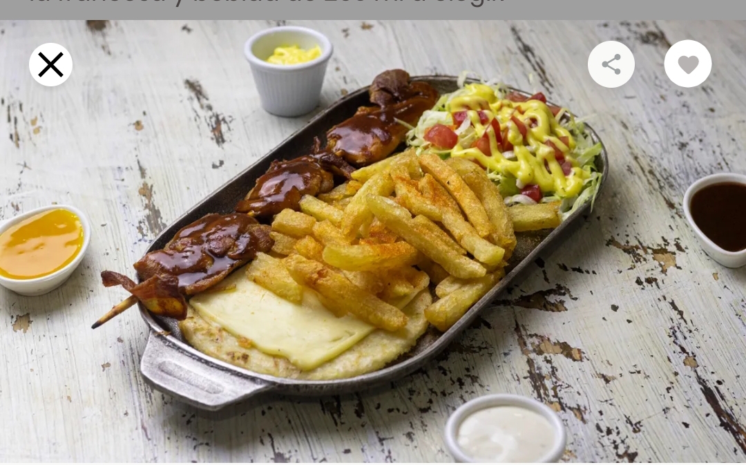 2 chuzos de pollo, ensalada, arepa con queso, papas a la francesa.