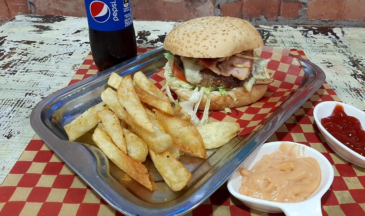 Combo Hamburguesa Especial carne de res 100gr tocinetas queso mozzarrella ensalada de lechuga y tomate + papas fritas + gaseosa 250ml