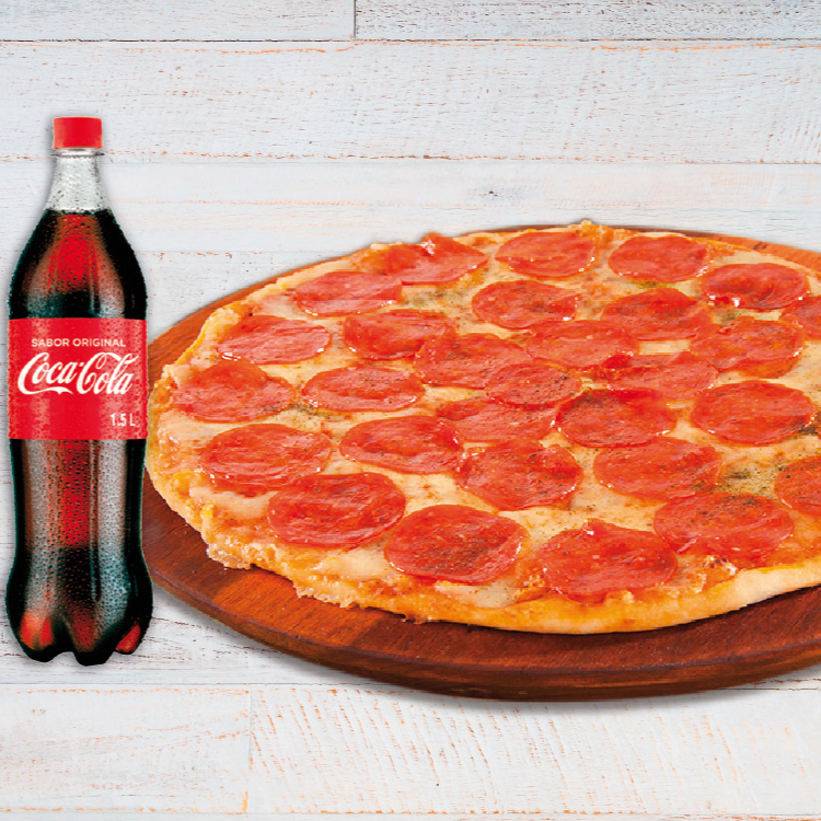 pizza personal 4 porciones de pepperoni , masa delgada y crujiente , queso mozzarrella acompañada de gaseosa 250 ml