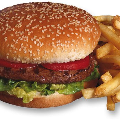 Hamburguesa sencilla con carne de res 100gr, pan con ajonjoli , tomate y lechuga frescas mas salsas + Papas Fritas