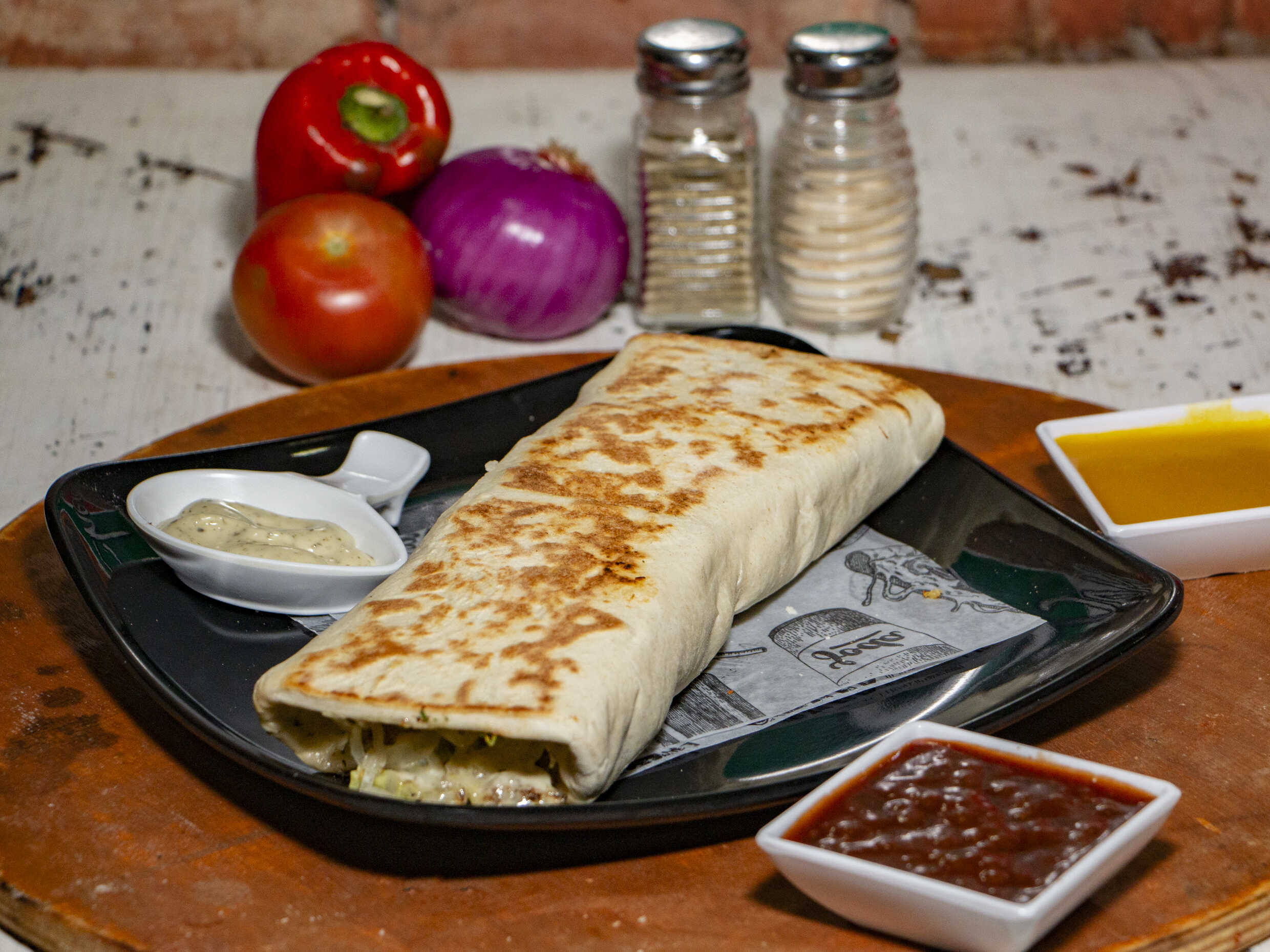 Carne, pollo, ensalada, queso mozzarella, tocineta y salsa de ajo.
