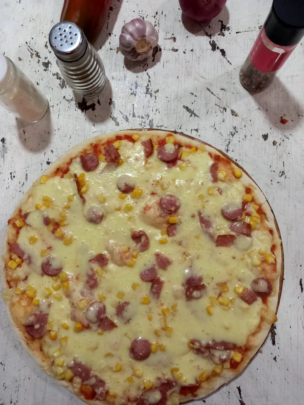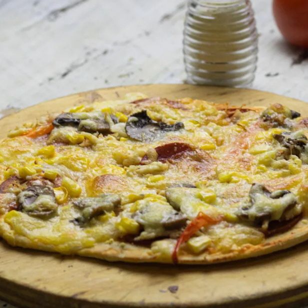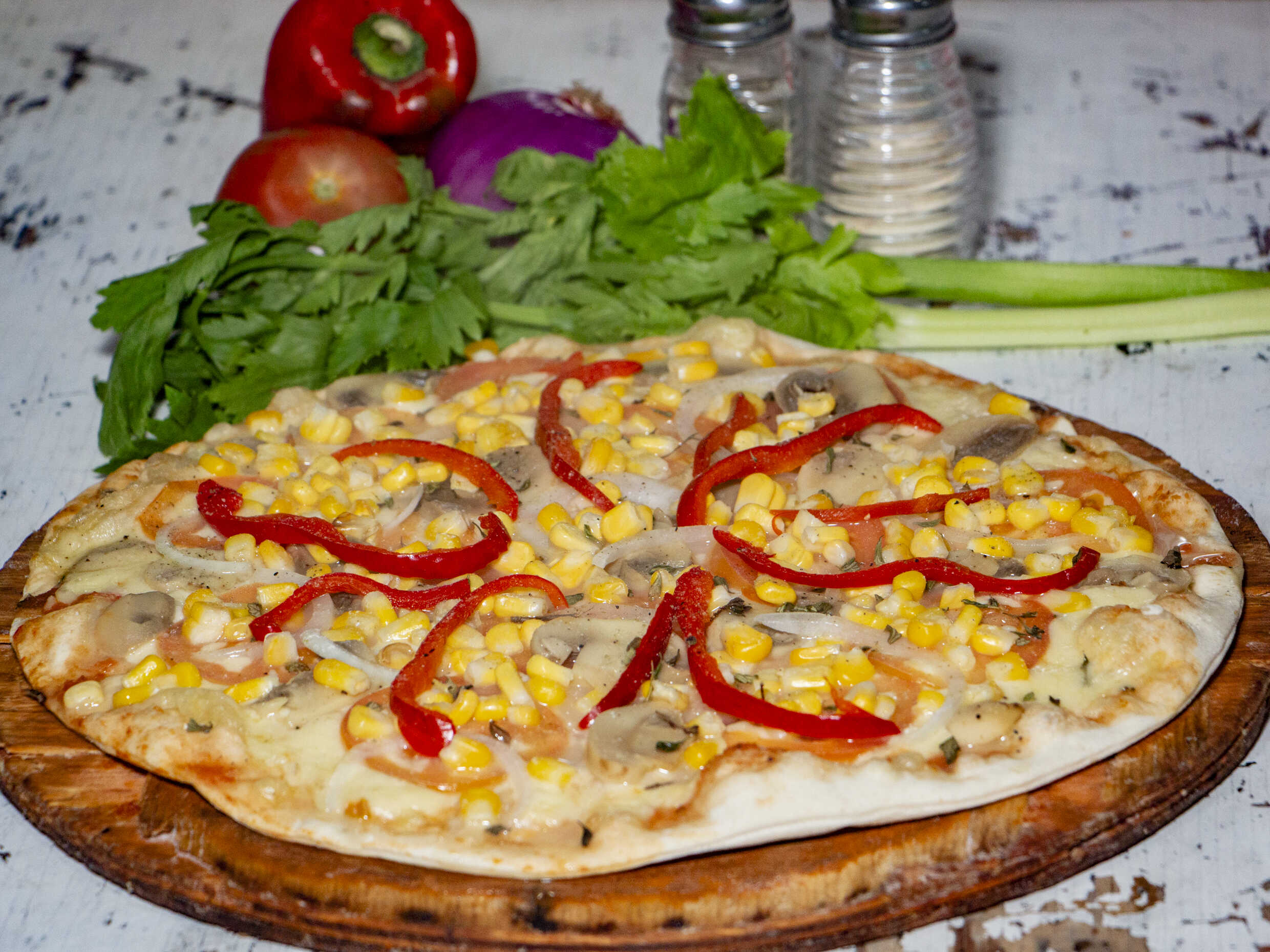 Doble queso, champiñones, tomate, cebolla, pimentón y maíz tierno.