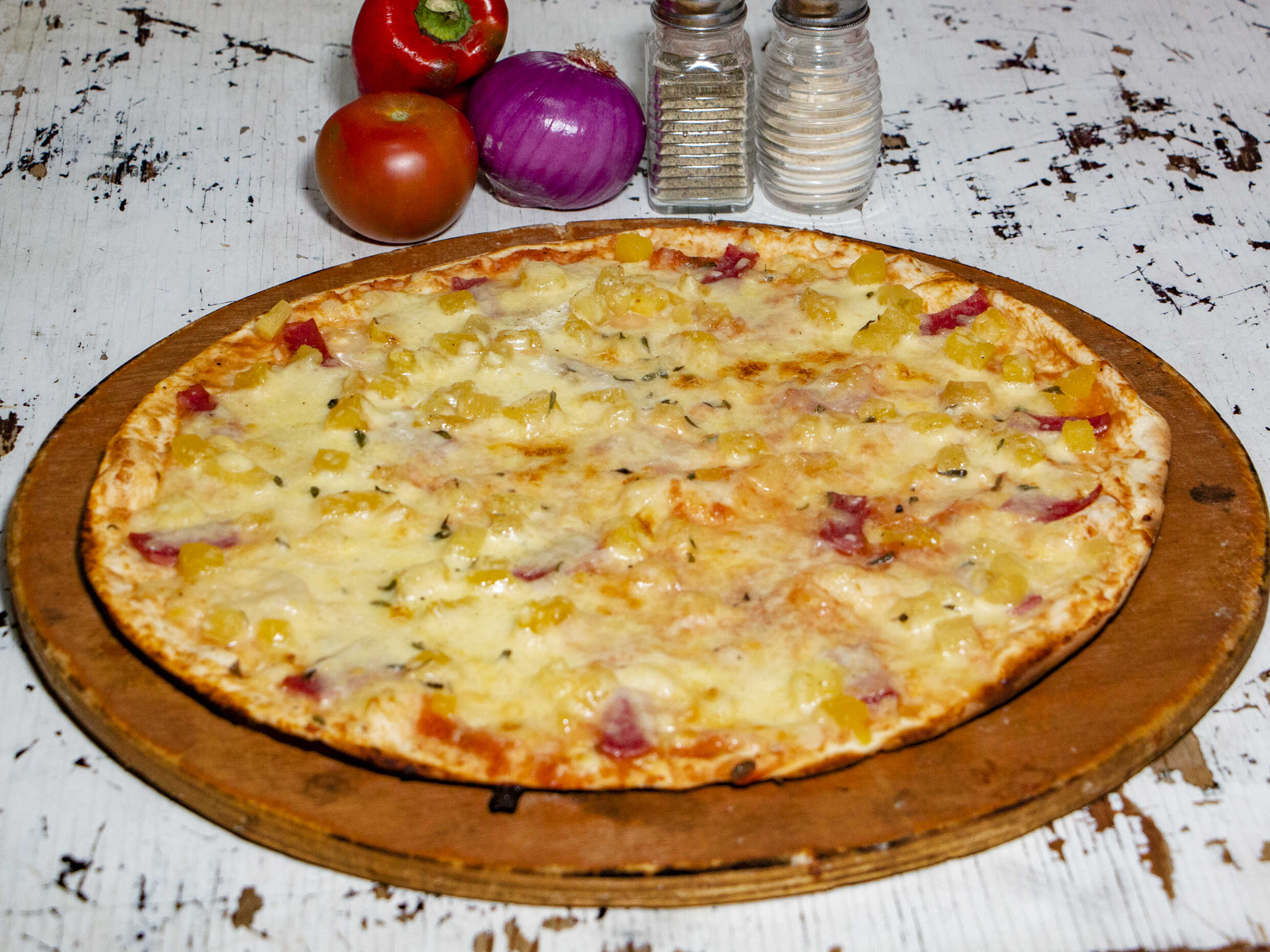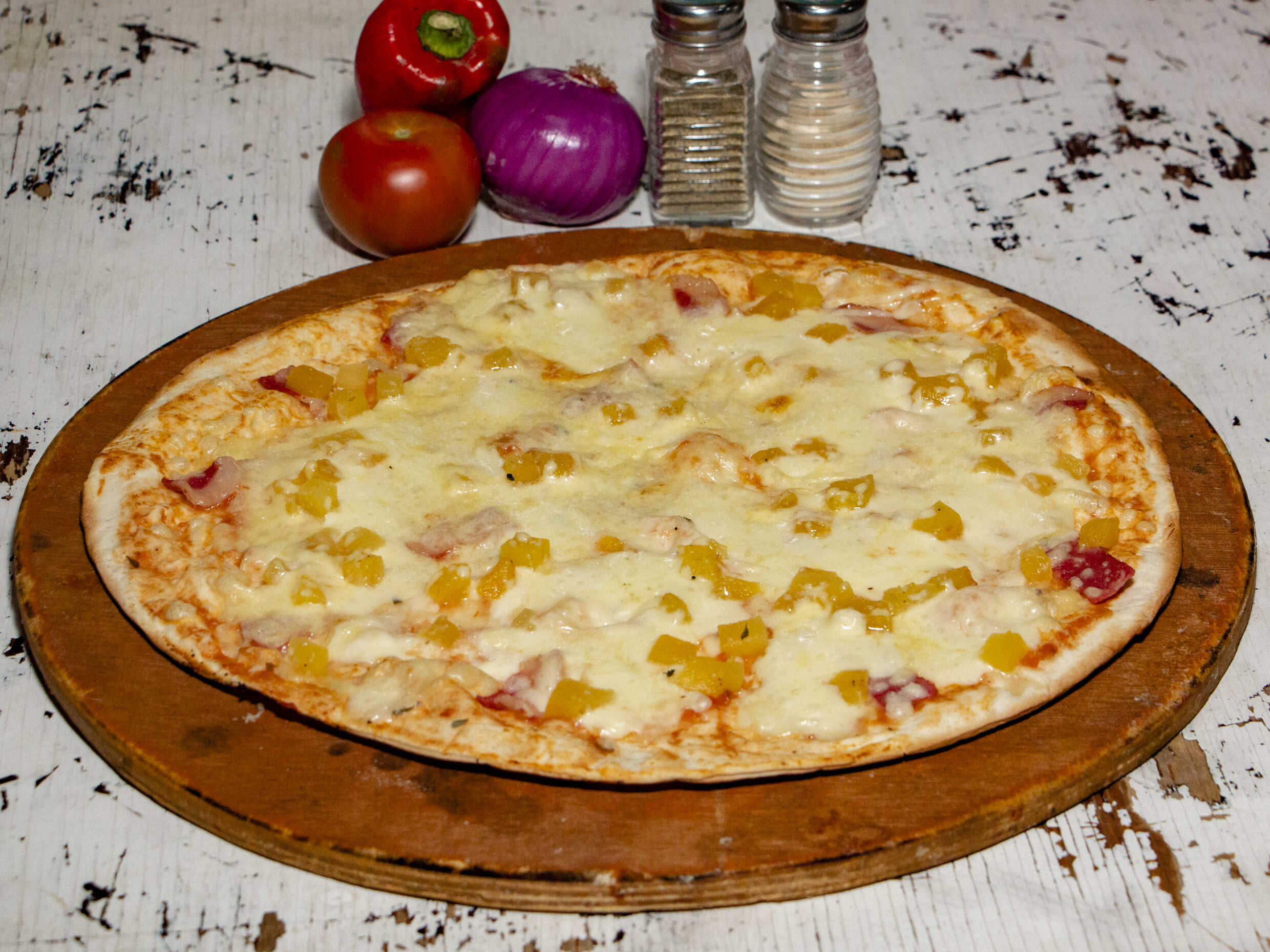 Pizza de 2 ingredientes con doble queso jamon y piña masa artesanal delgada