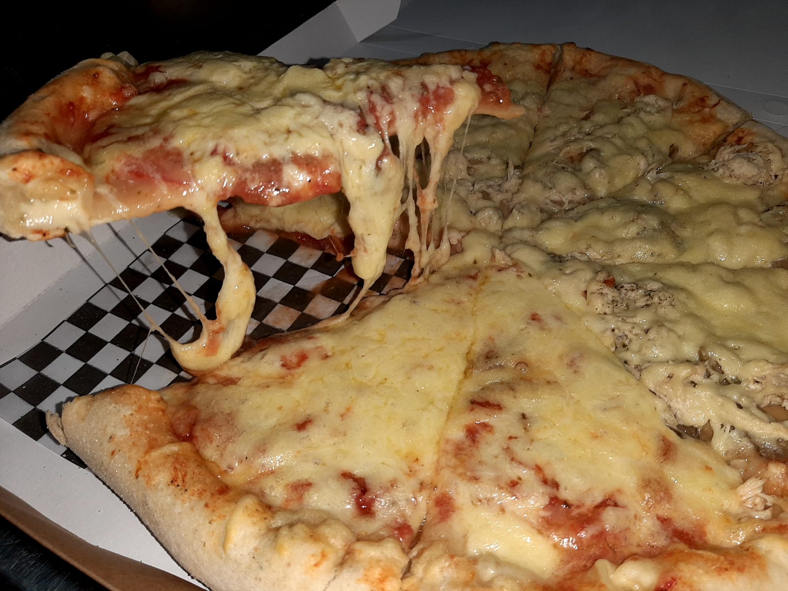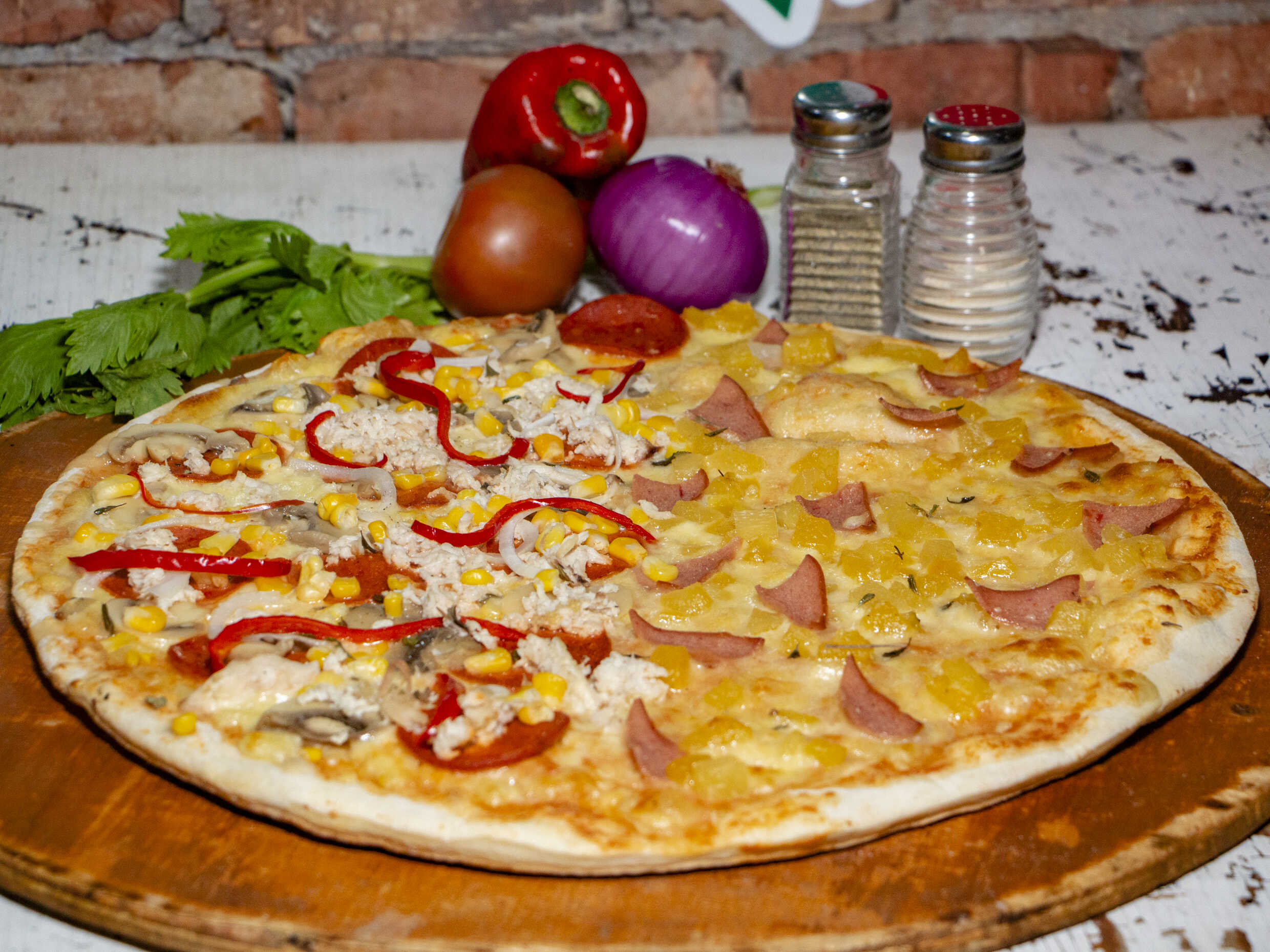 Doble queso, champiñones, pollo, peperoni, maíz tierno, cebolla y pimentón.