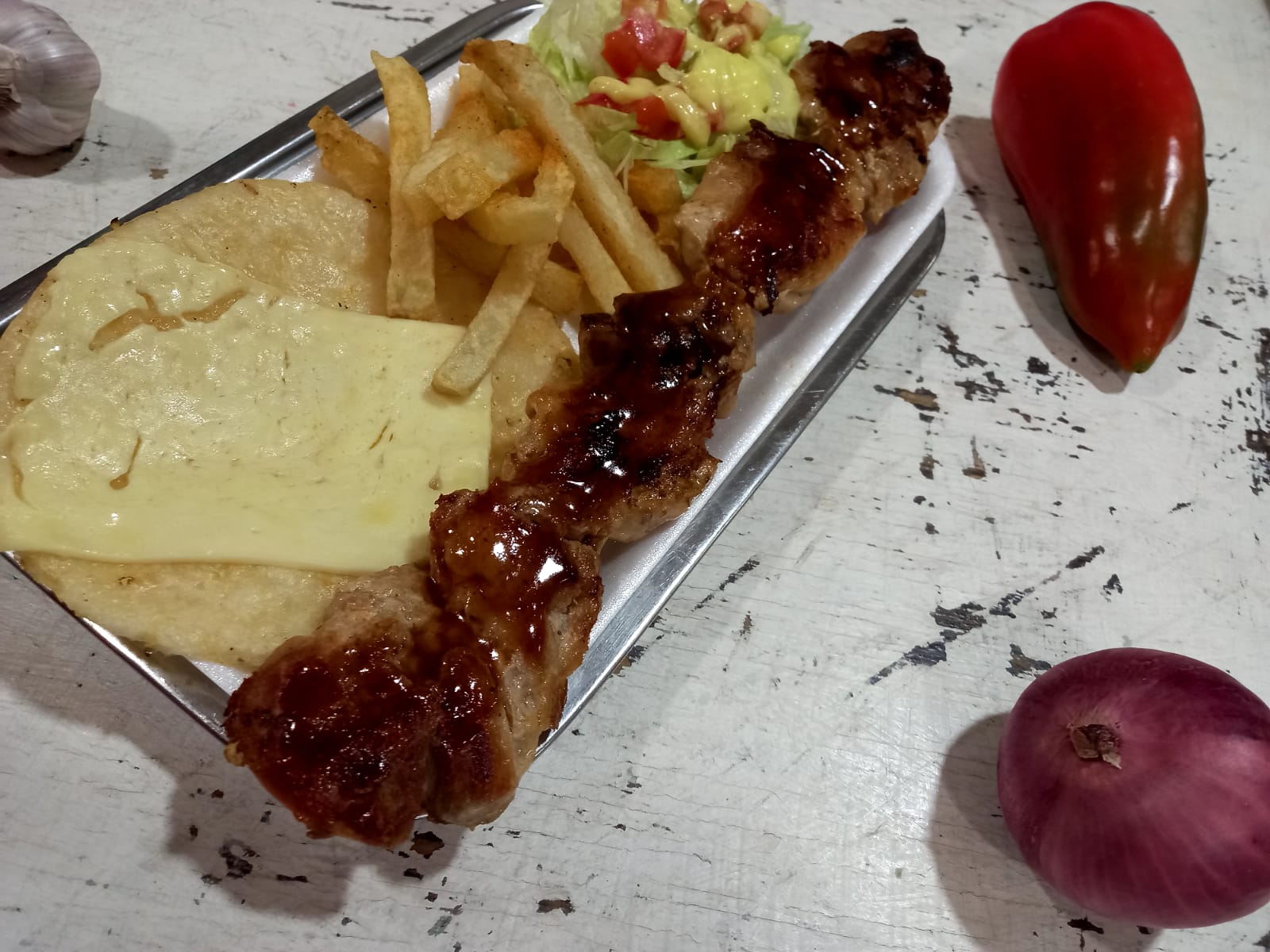 Chuzos de pollo + ensalada + arepa con queso + papas a la francesa