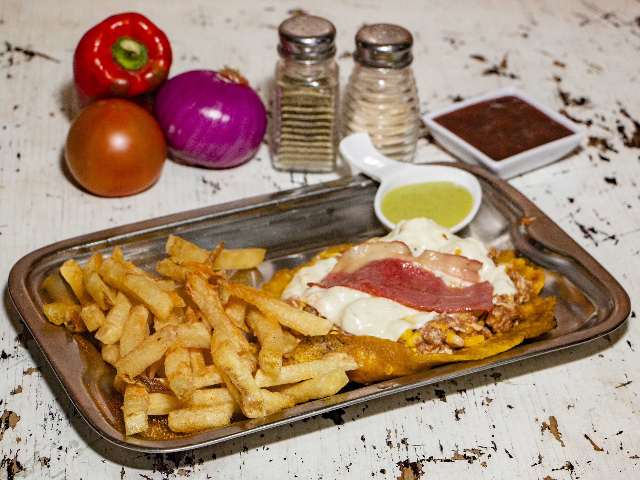 patacón , carne, pollo desmechado, maicitos, queso, tocineta.