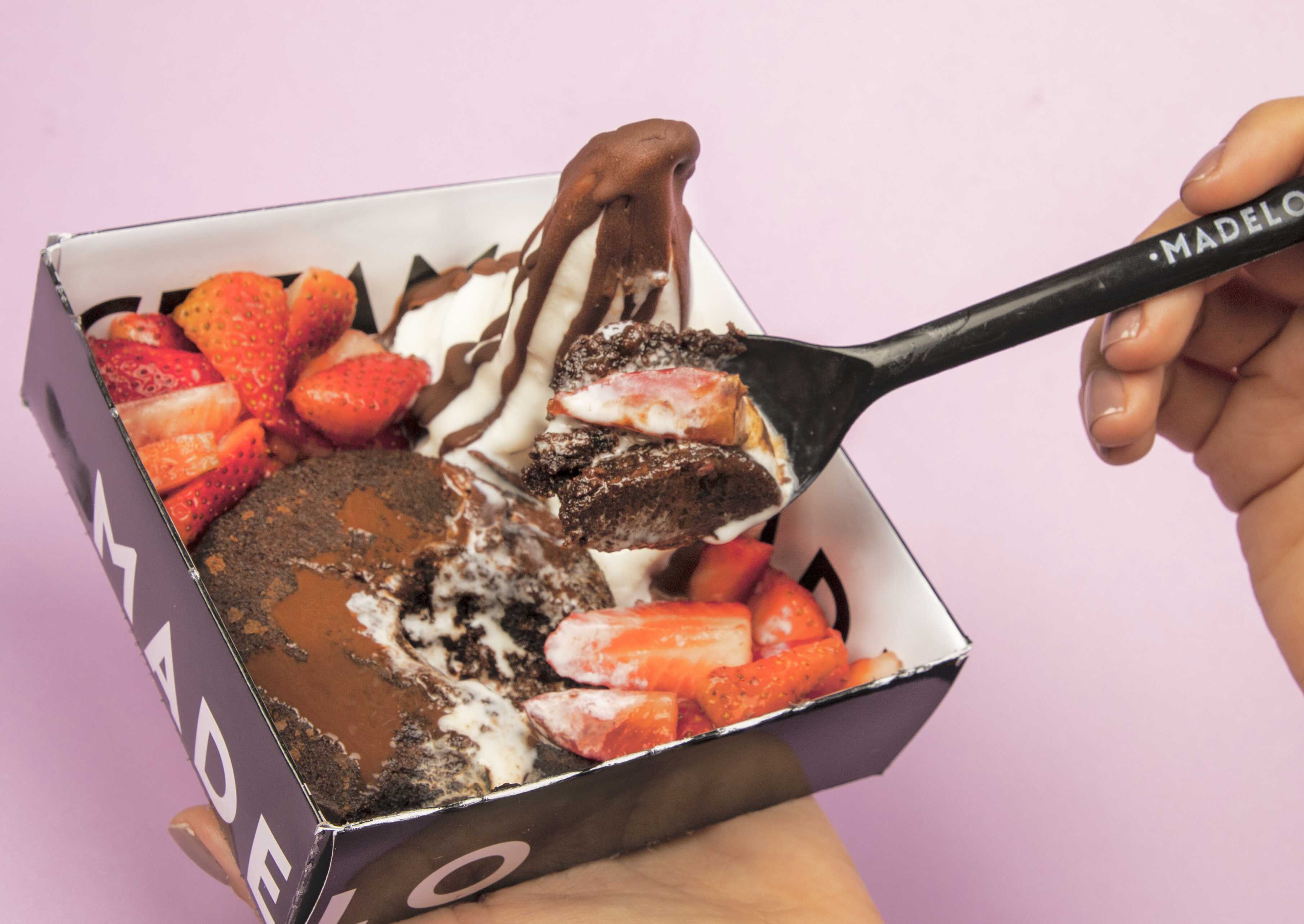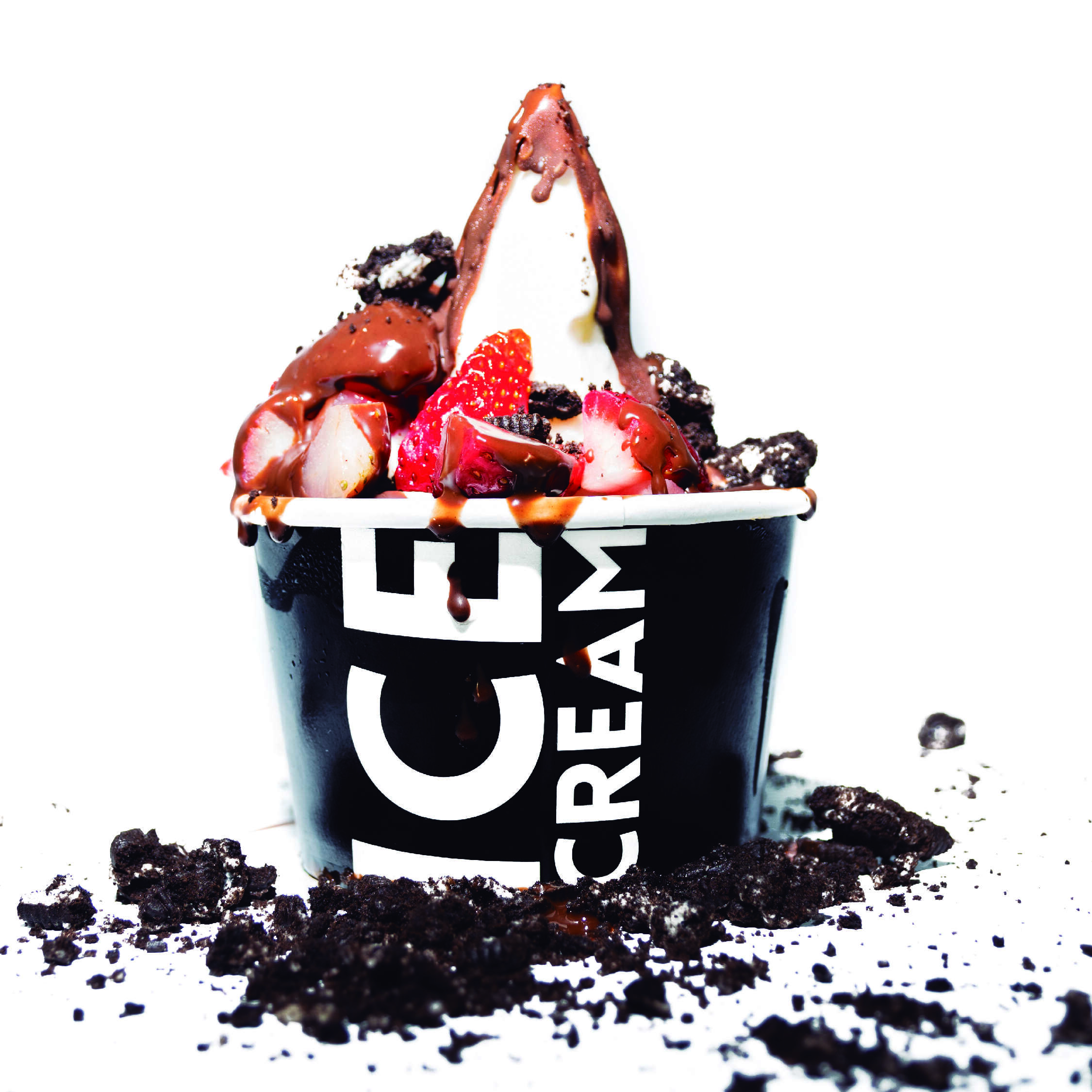 Un madelo que nos encanta, helado de yogurt natural con fresas, Oreo y chocolate fondue, tamaño 8 oz.