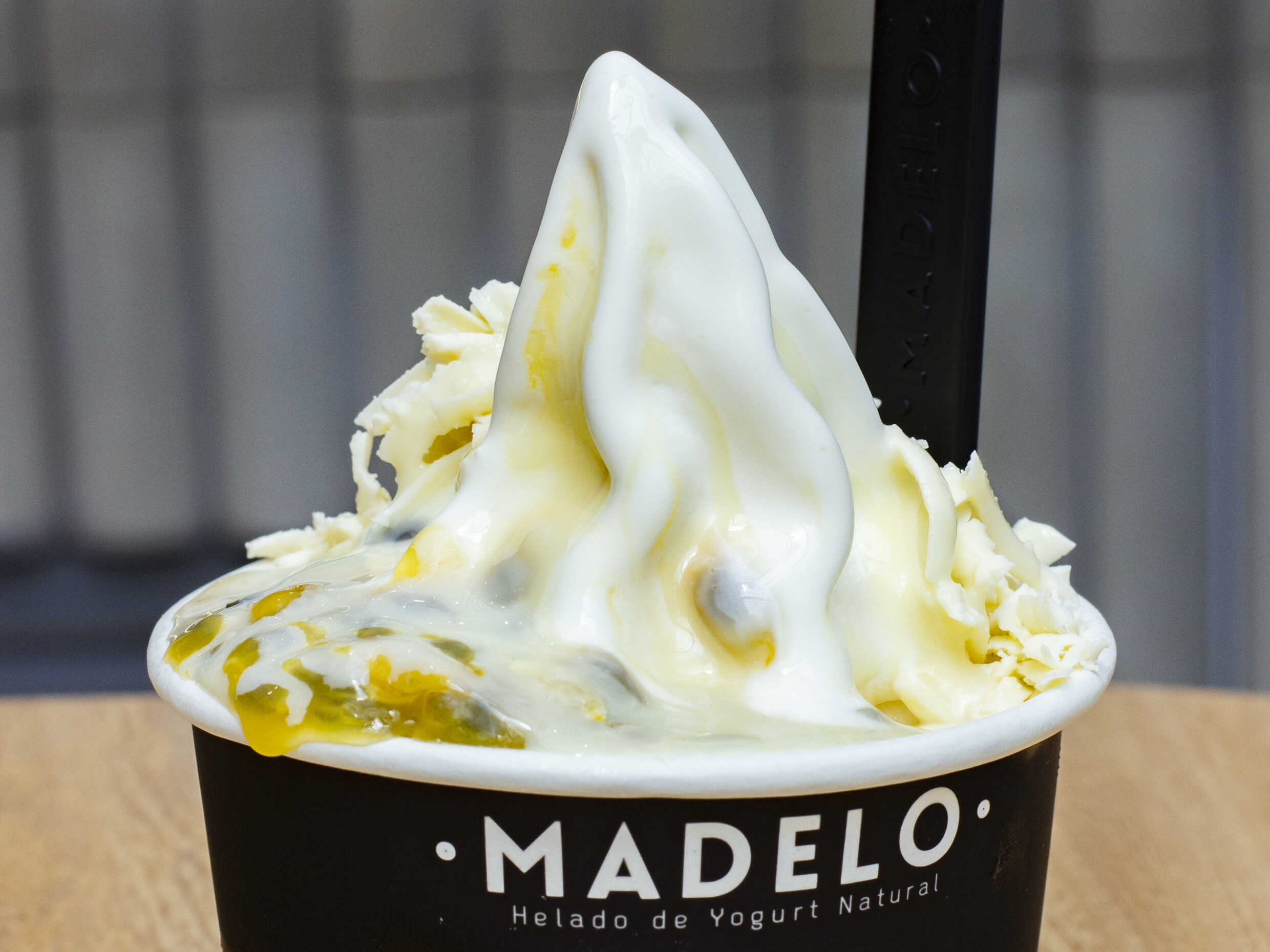 Helado de yogurt bajo en grasa y con menos azúcar. Servido en vaso ecológico de 8 oz con maracuyá, lecherita y queso.