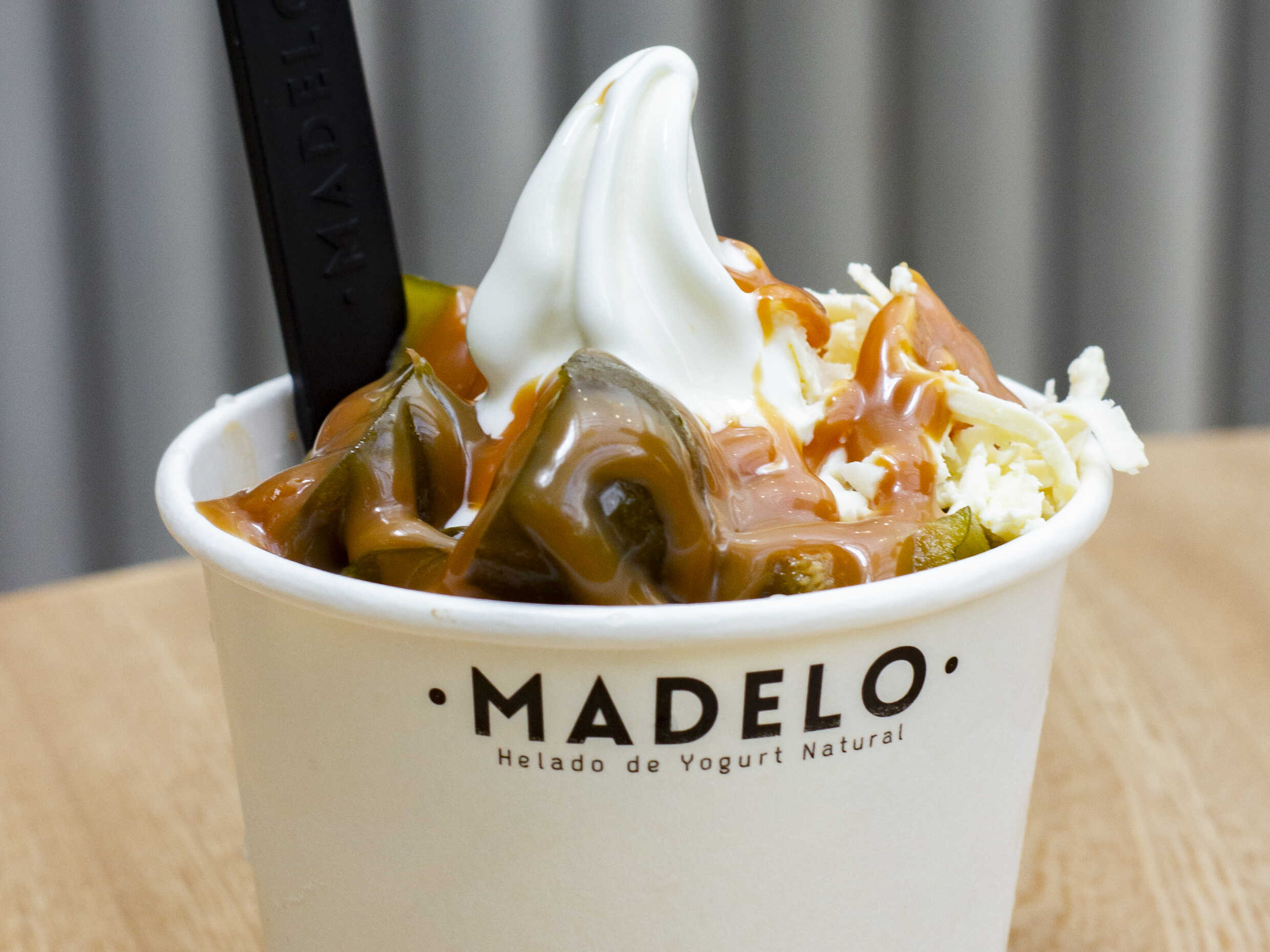 Helado de yogurt bajo en grasa y con menos azúcar. Servido en vaso ecológico de 8oz con brevas, queso y arequipe.