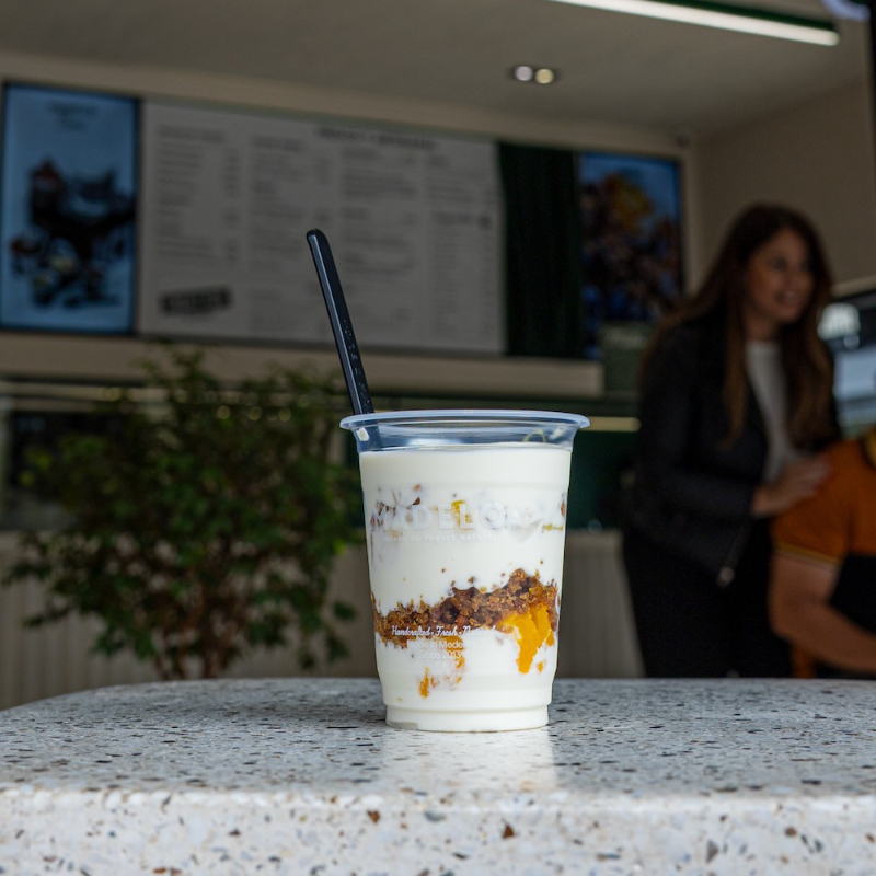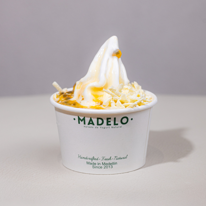Helado de yogurt bajo en grasa y con menos azúcar. Servido en vaso ecológico de 8 oz con maracuyá, lecherita y queso.
