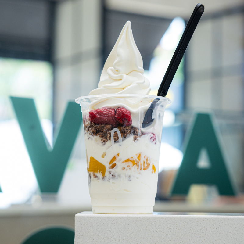 Helado de yogurt bajo en grasa y con menos azúcar. Elige tus toppings y arma tu helado soñado. Usamos empaques ecológicos.