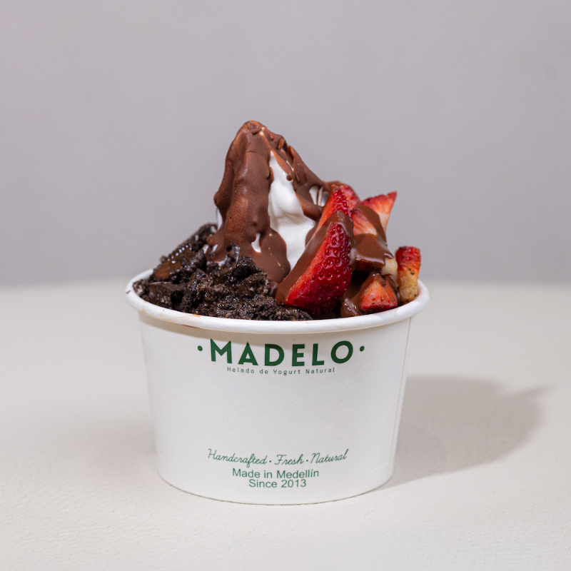 Un madelo que nos encanta, helado de yogurt natural con fresas, Oreo y chocolate fondue, tamaño 8 oz.