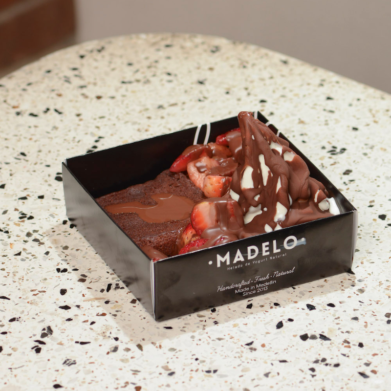 Brownie caliente con helado de yogurt natural, fresas y chocolate fondue.