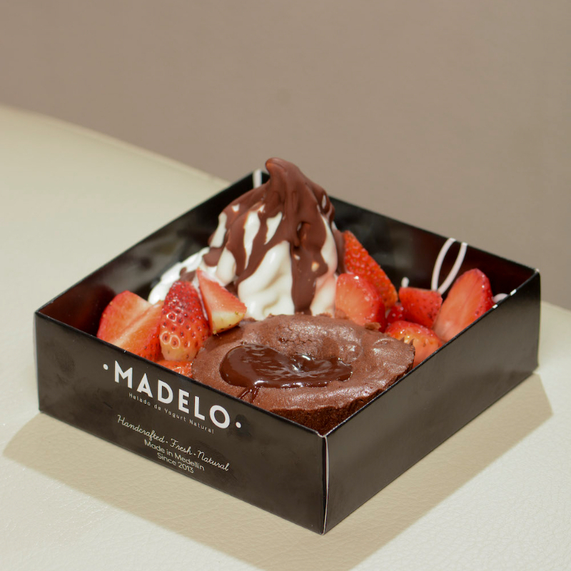 Volcán de chocolate, acompañado con helado de yogurt natural, fresas y chocolate fondue.
