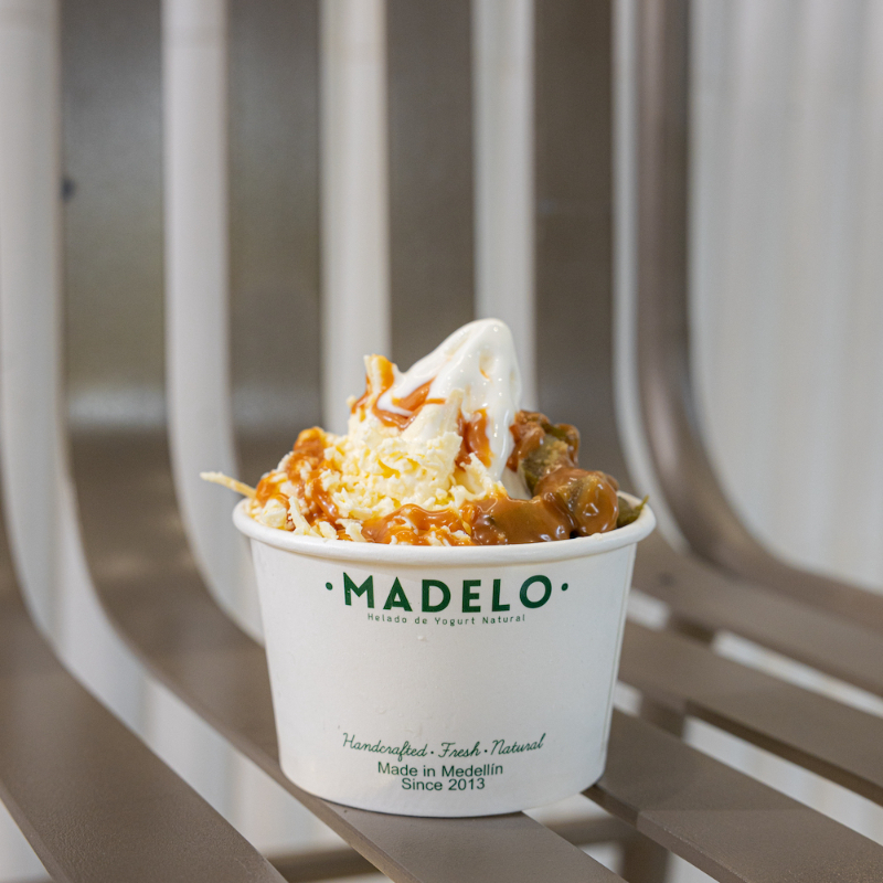 Helado de yogurt bajo en grasa y con menos azúcar. Servido en vaso ecológico de 8oz con brevas, queso y arequipe.