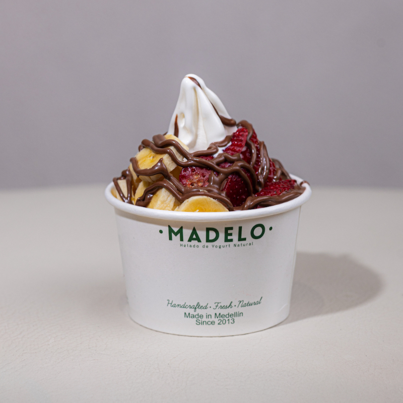 Helado de yogurt con fresas, banano y nutella, tamaño 8 oz.