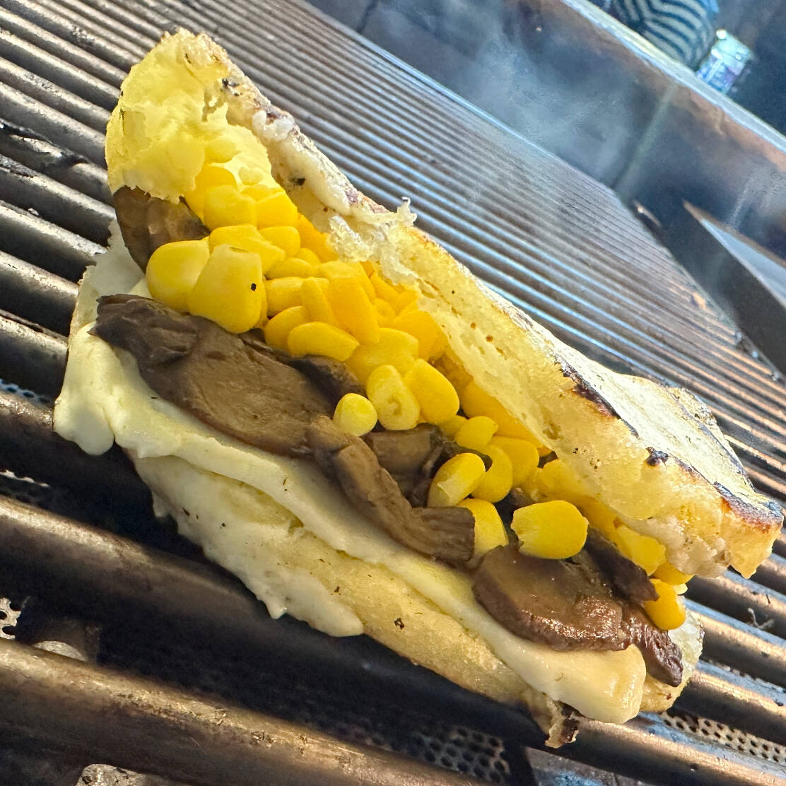 Deliciosa arepa rellena con maicitos, champiñones y mucho queso