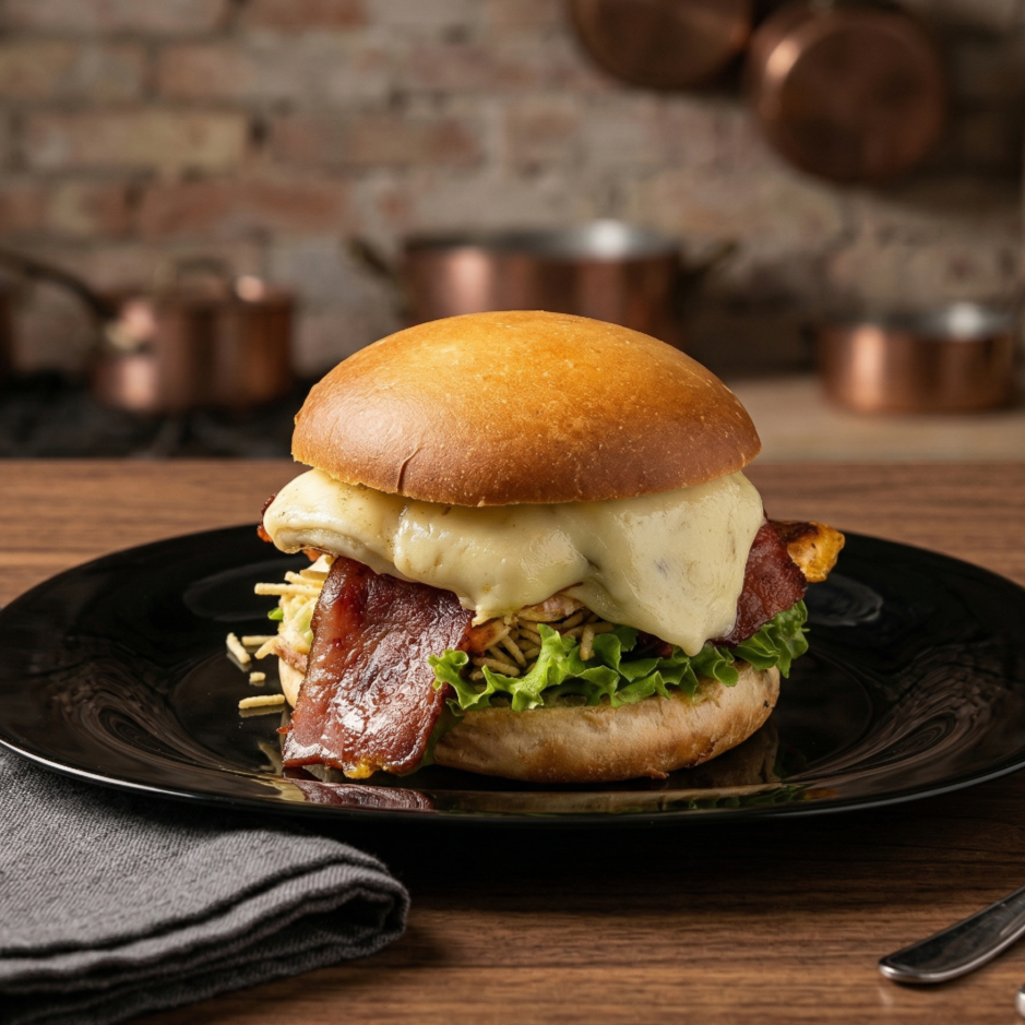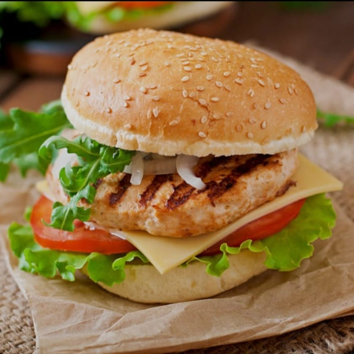 filete de pollo, queso, tocineta, ripio , lechuga tomate, salsas de la casa