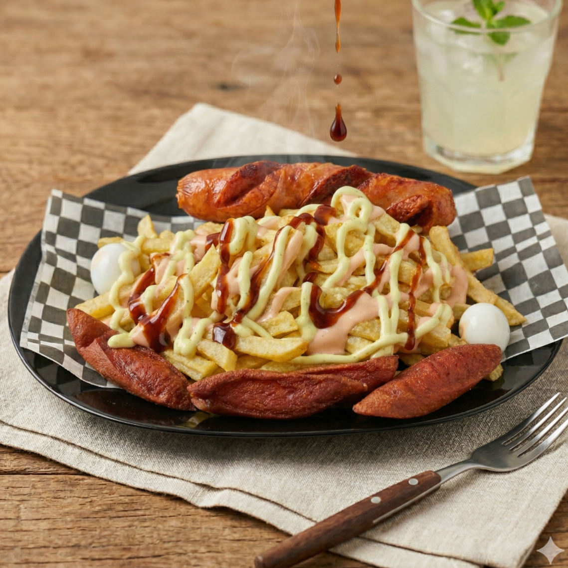 Papas a la francesa, chorizo de pollo, huevo, salchicha, salsas de la casa