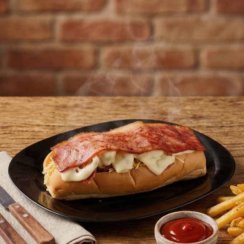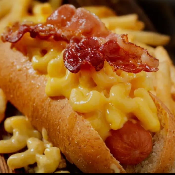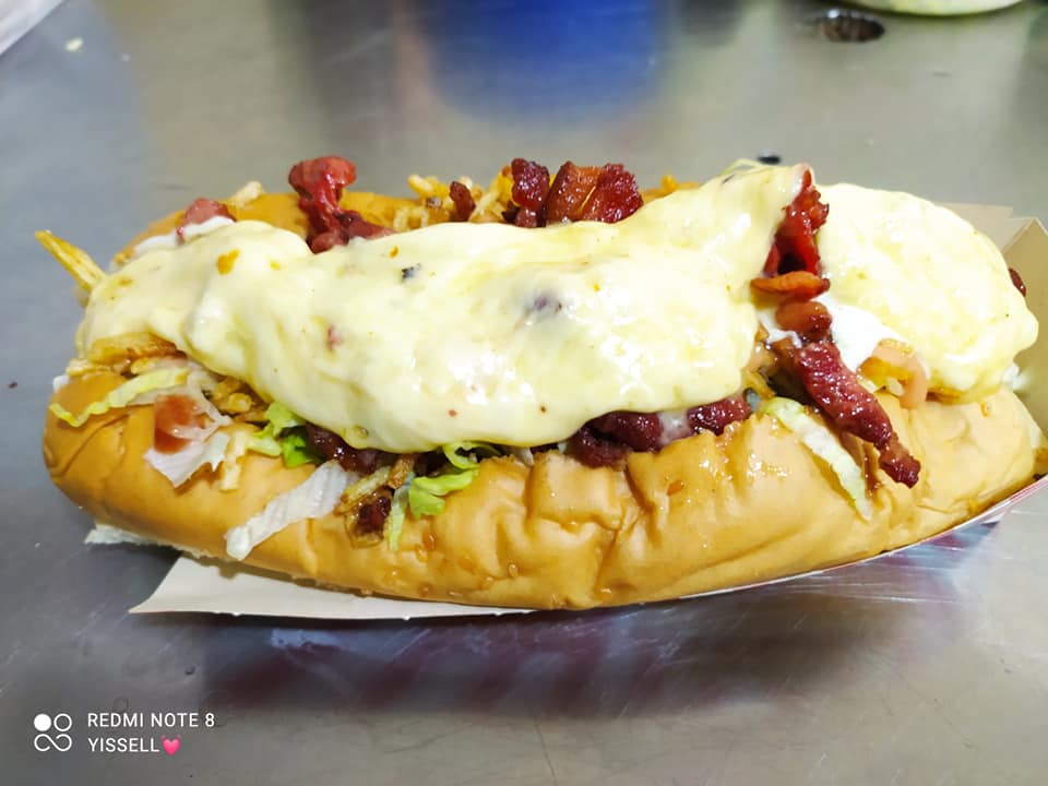 salchicha, tocineta, queso, ripio de papa, lechuga y salsa de la casa