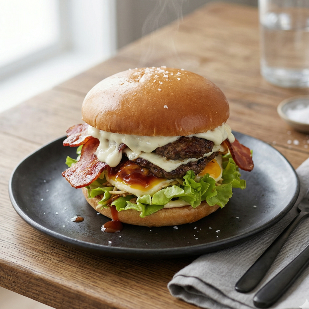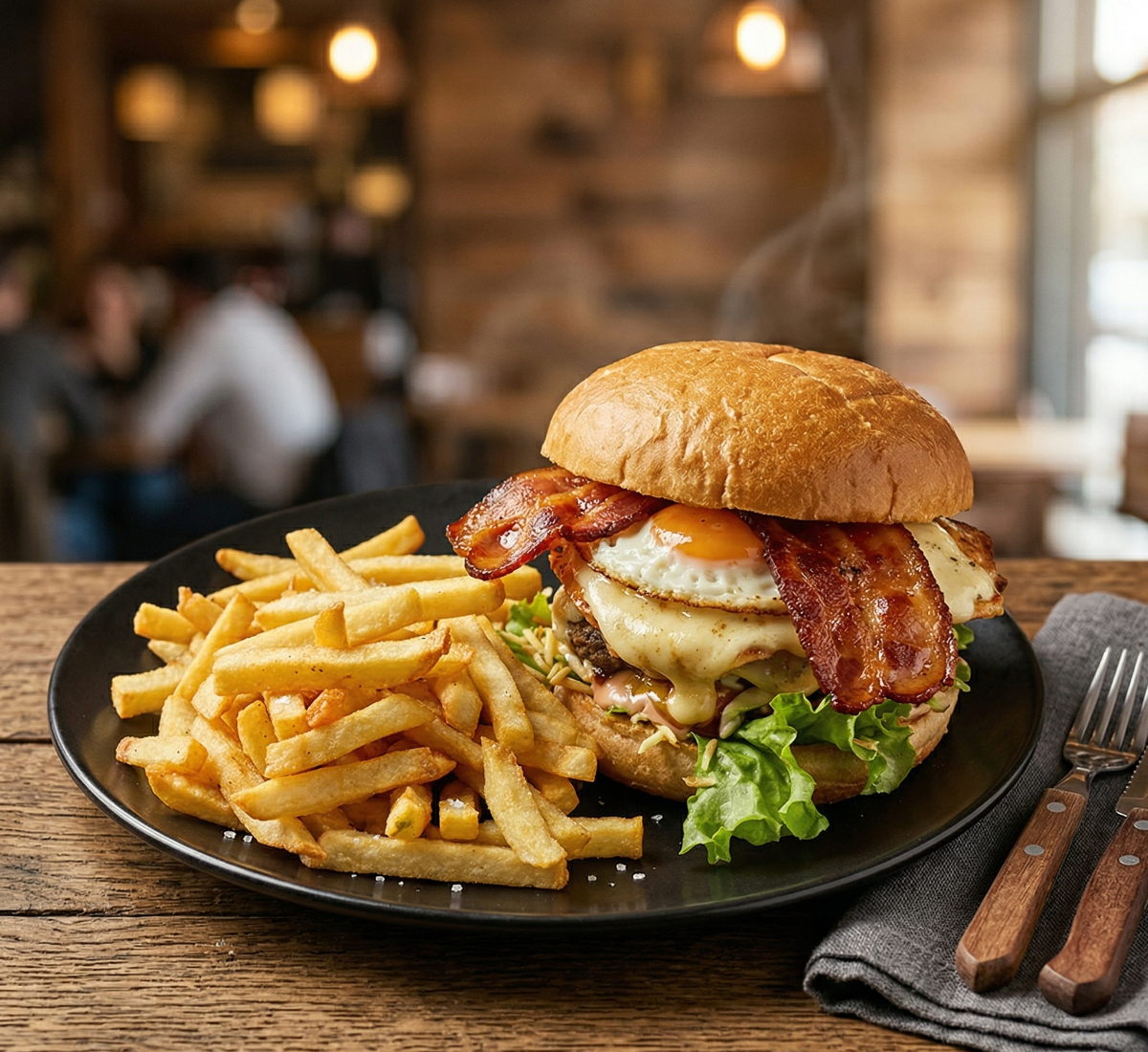 Hamburguesa con doble carne de res artesanal ( 200 gramos) , tocineta ( 1 tira) , queso mozzarella, ripio de papa ,lechuga , tomate , salsa de la casa+ 1 gaseosa de 250 mililitros ( la que este disponible en el momento)