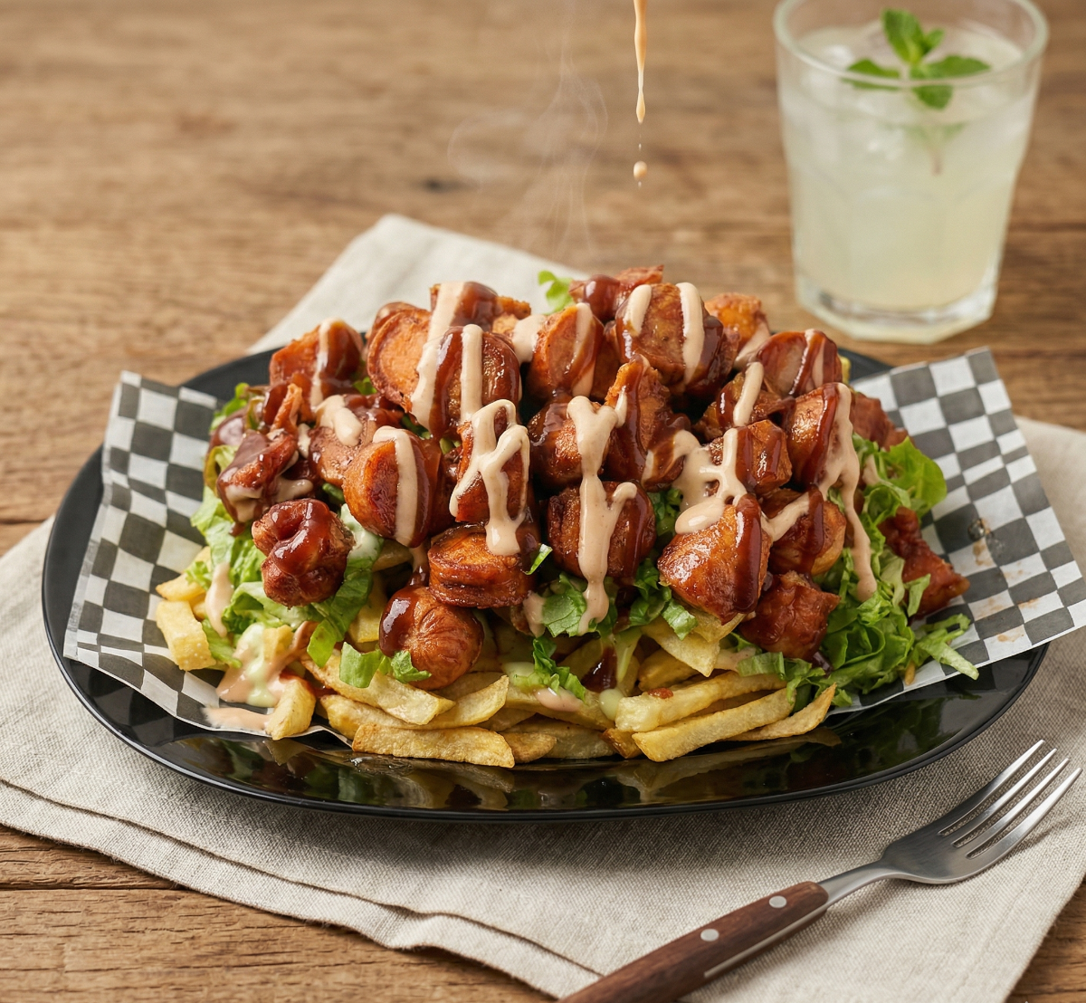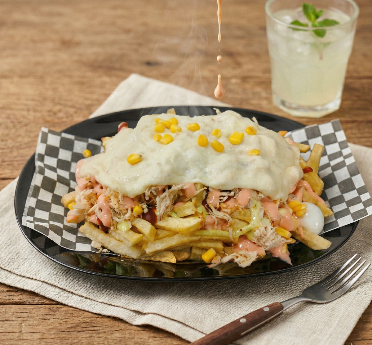 papas a la francesa , pollo desmechado , queso fundido , huevos , salsa de la casa