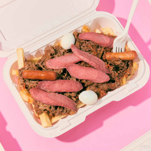 Papas mas pollo desmechado, 6 salchichas, 2 chorizos, 2 huevitos, queso mozzarella, tocineta.
