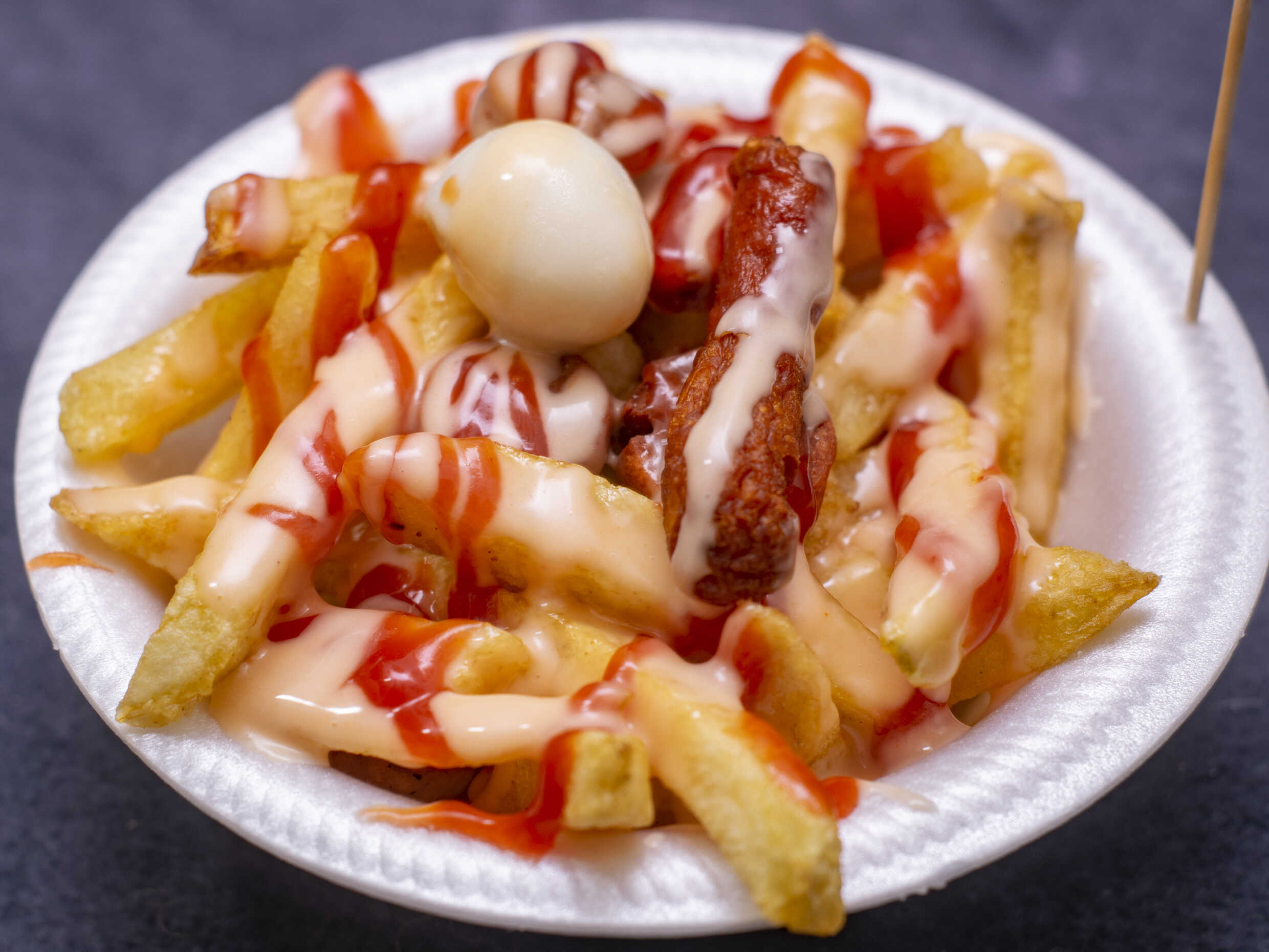 Mandi Bombón de Pollo individual: Papas fritas (aprox. 300 g), 4 salchichas, 2 huevos de codorniz, 2 chorizos cocteleros y 1 bombón de pollo con la salsa de tu preferencia.