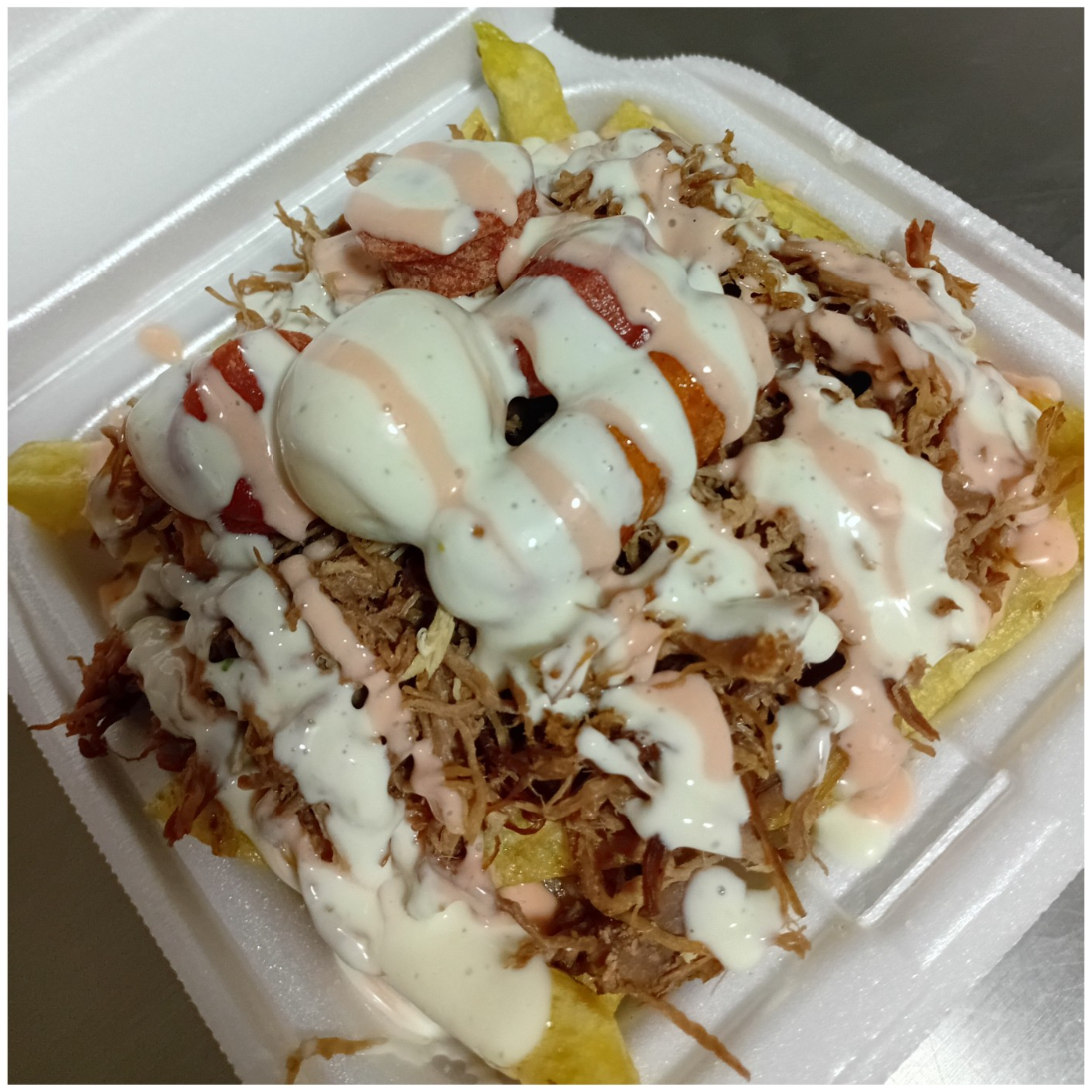 Papas más 3 salchichas más 1 huevito más 1 choricito más carne desmechada