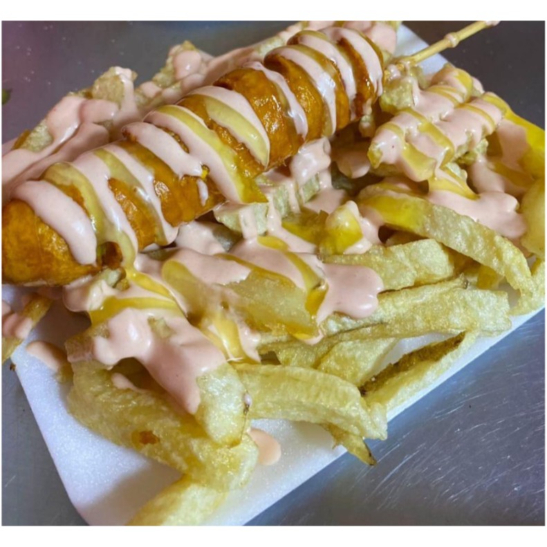 Papas más bombón de pollo más 4 salchichas más 2 huevitos más 2 choricitos