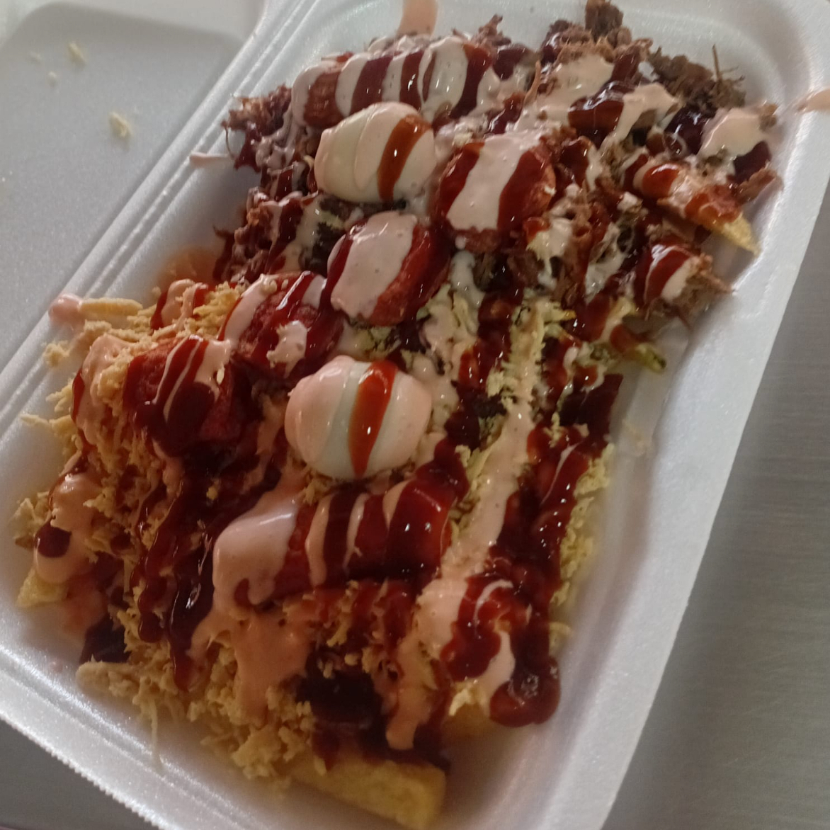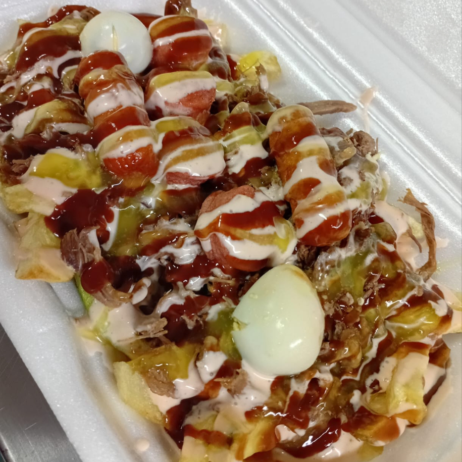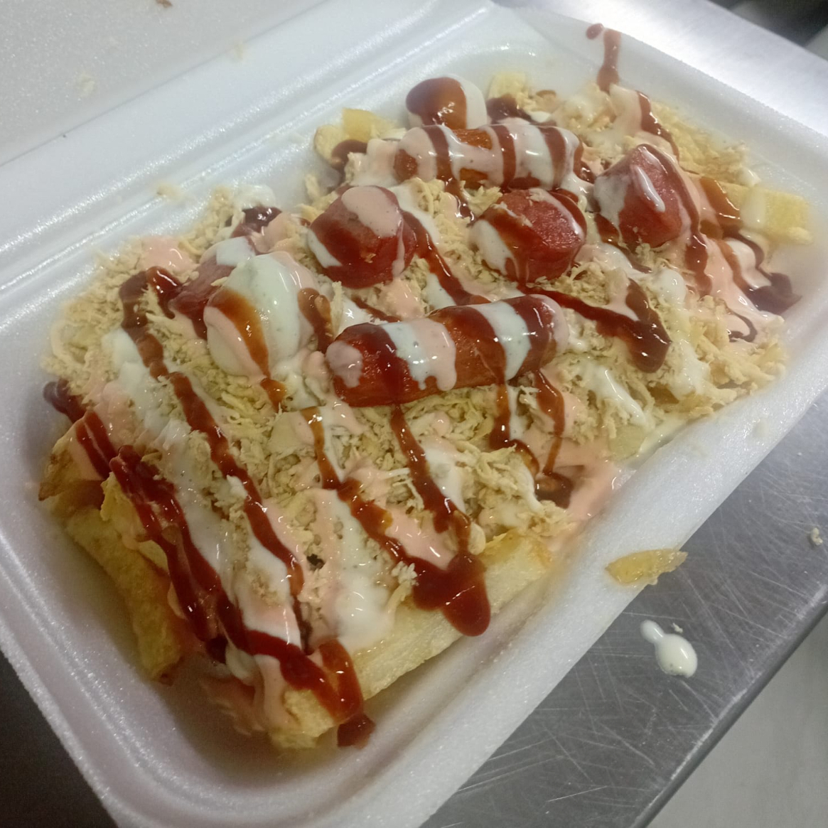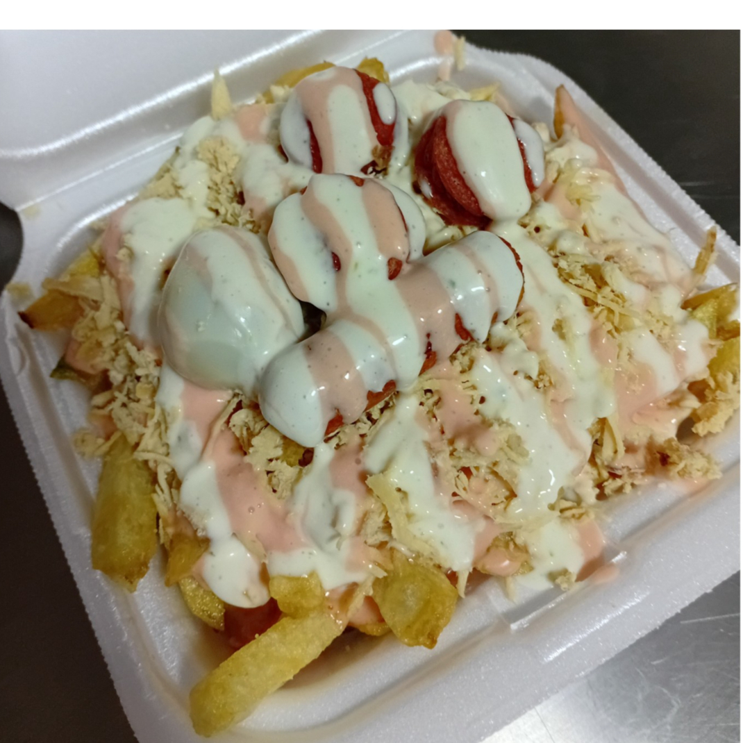 Papas más 3 salchichas más 1 huevito más 1 choricito más pollo desmechado