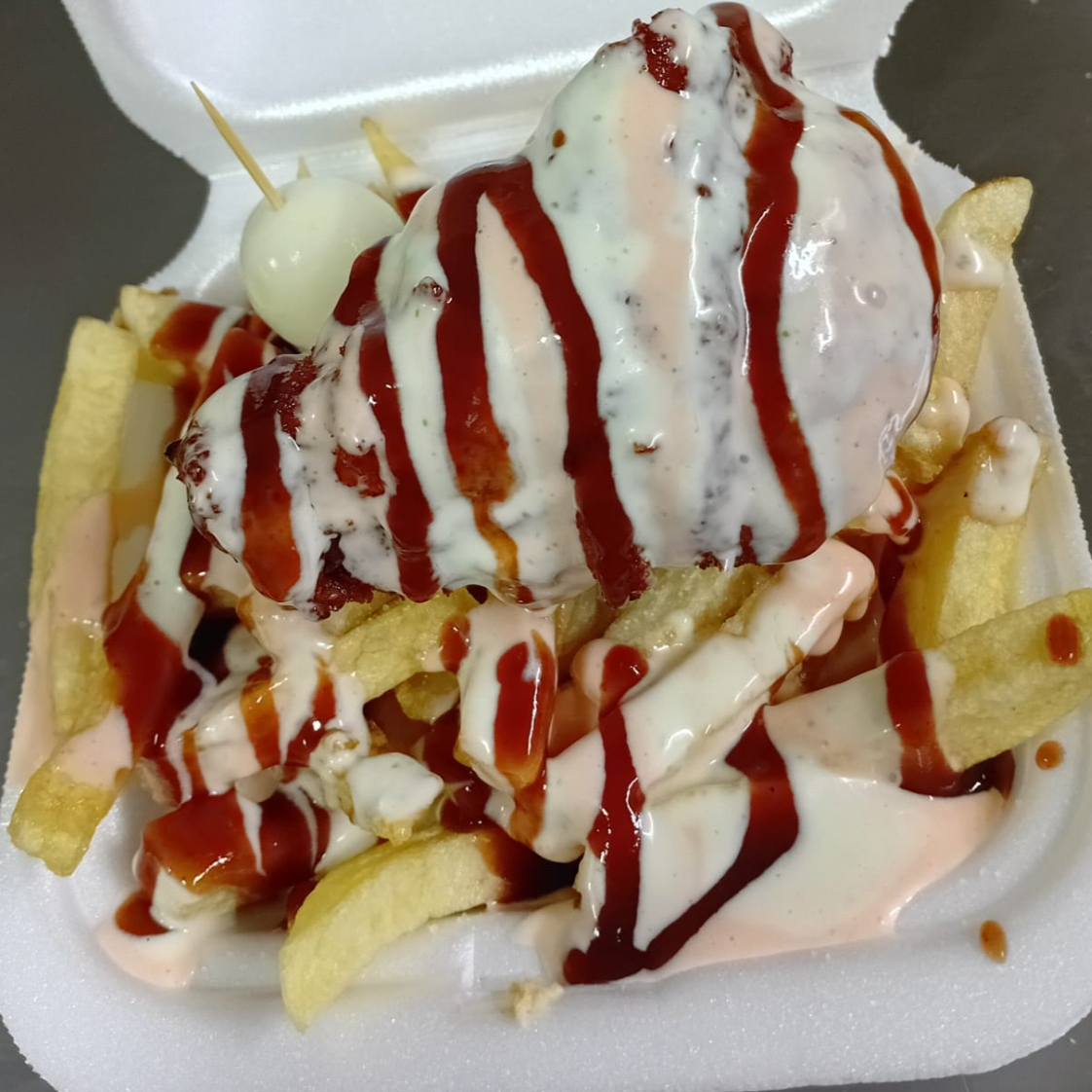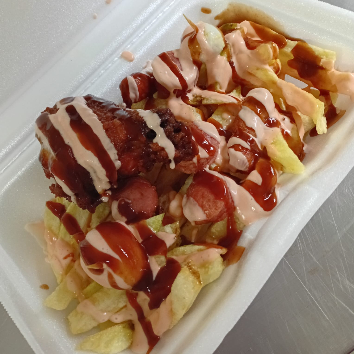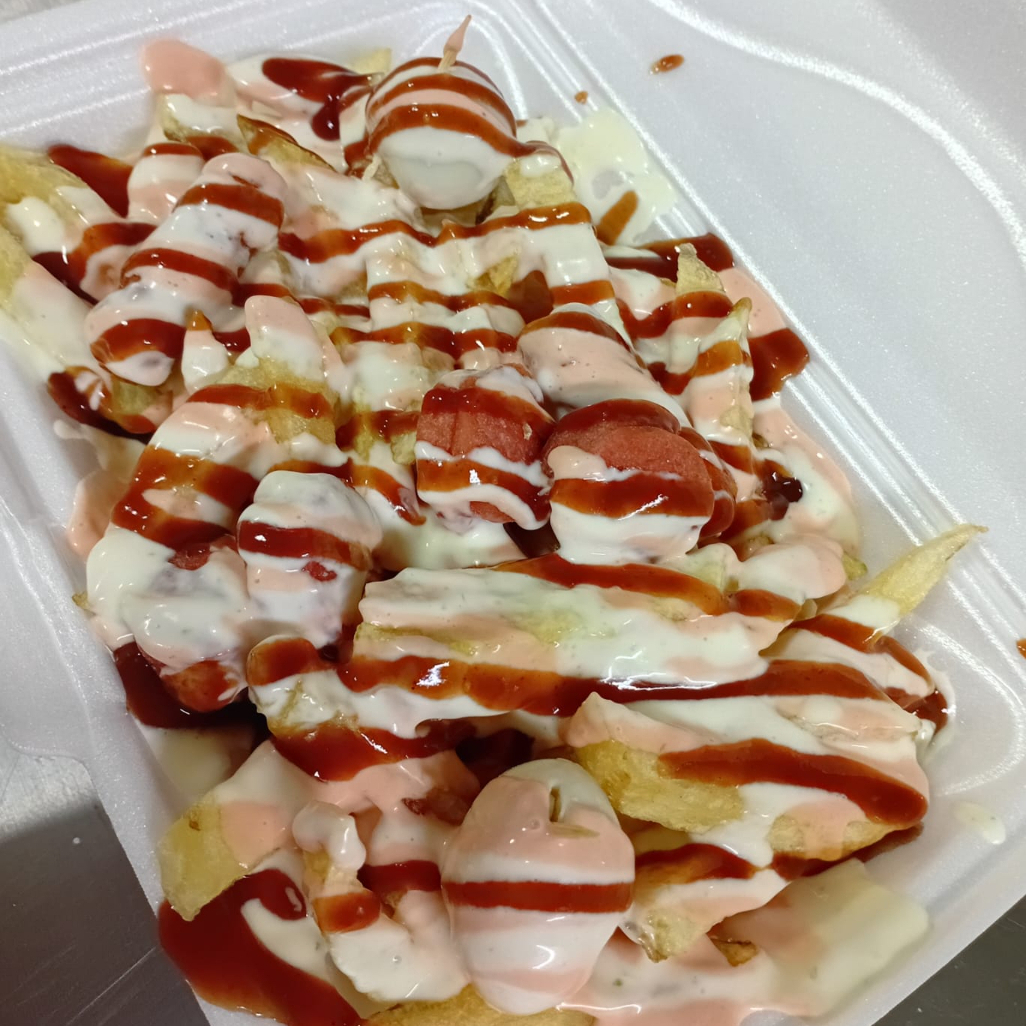 Papas más 3 salchichas más 1 huevito más 1 choricito más pollo desmechado