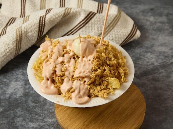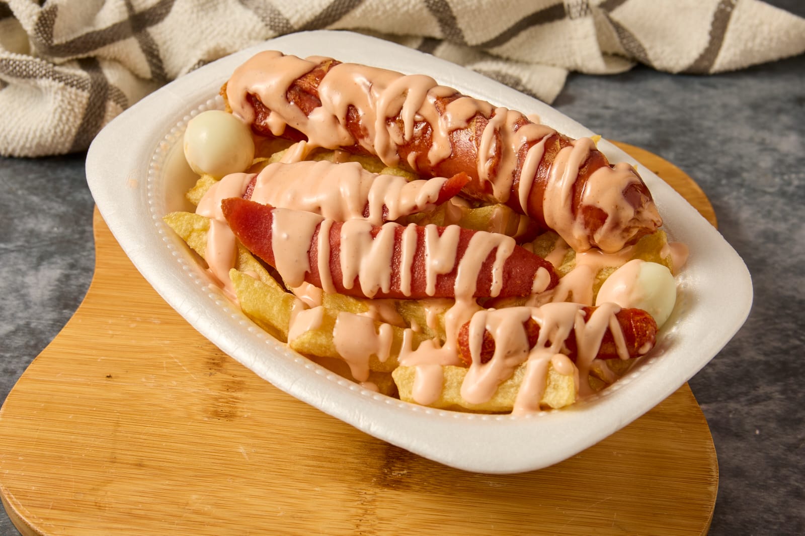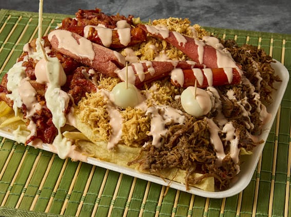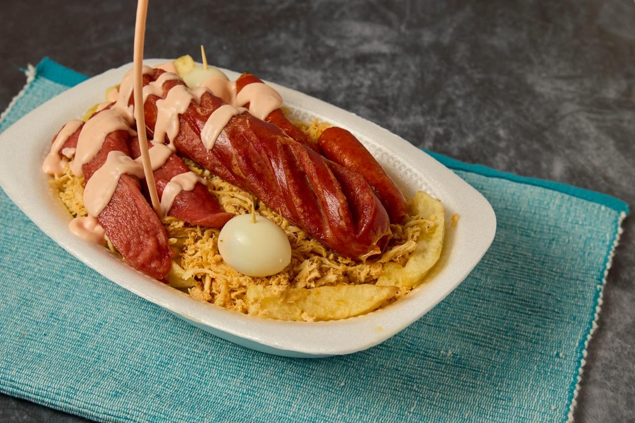 pollo desmechado, tocineta, 1 salchicha, 1 choricito y 1 huevo